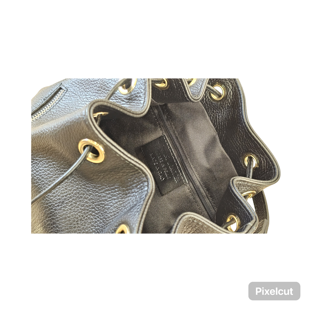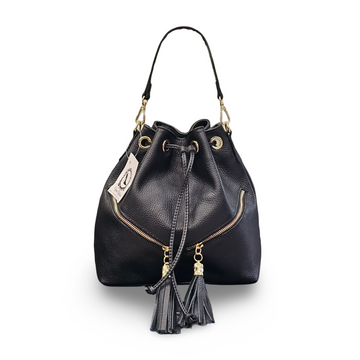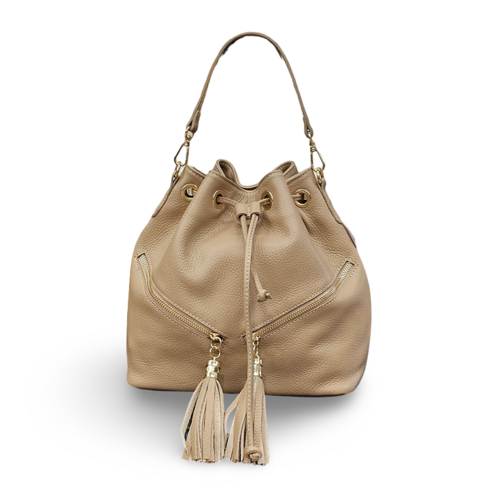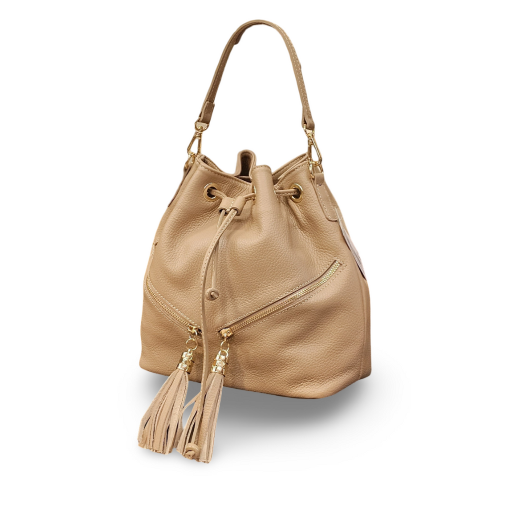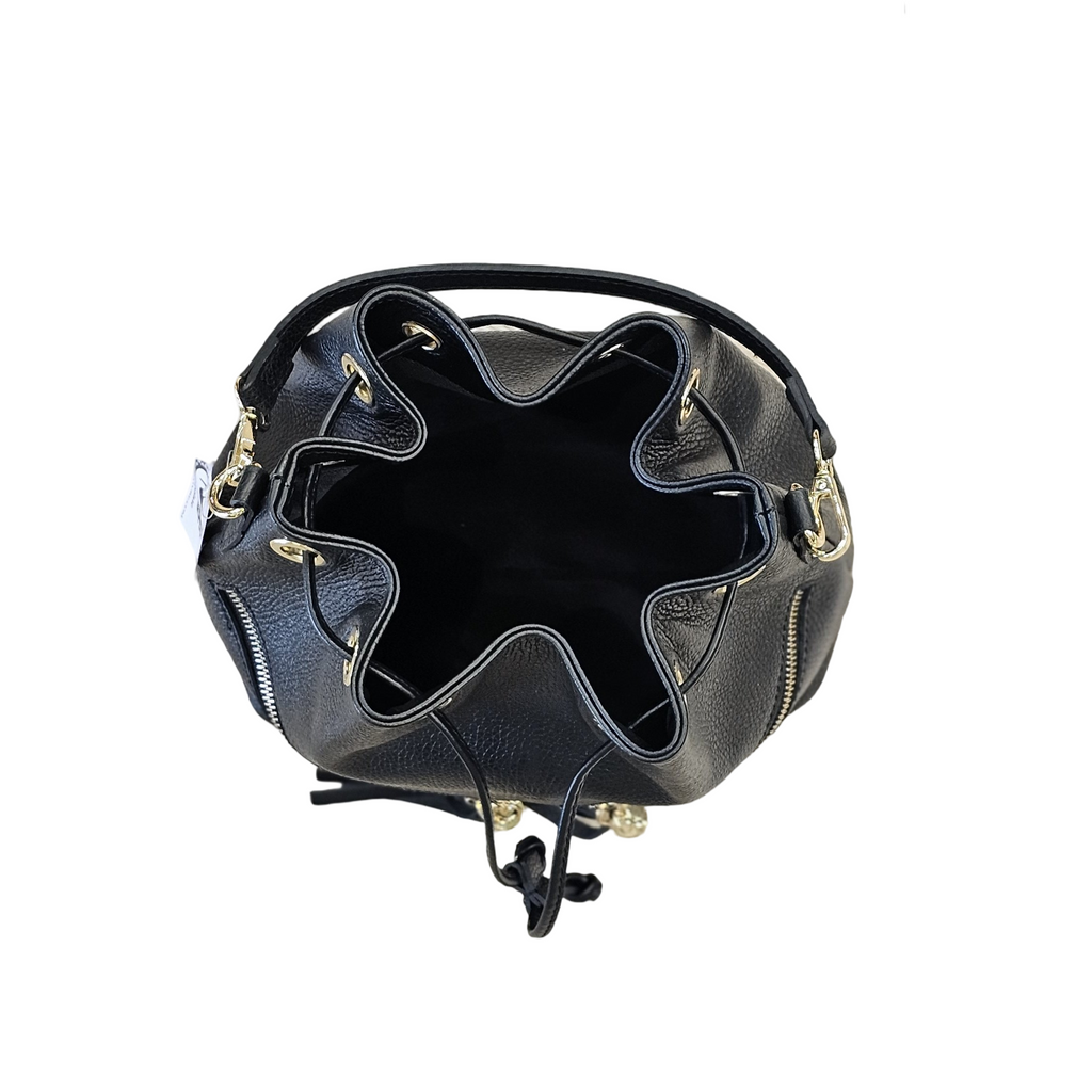 Borsa secchiello in vera pelle Made in Italy, elegante e funzionale. L’interno è dotato di cerniera per una migliore organizzazione e sicurezza degli oggetti. Completa di tracolla regolabile aggiuntiva, per un comfort e una versatilità d’uso ottimali.