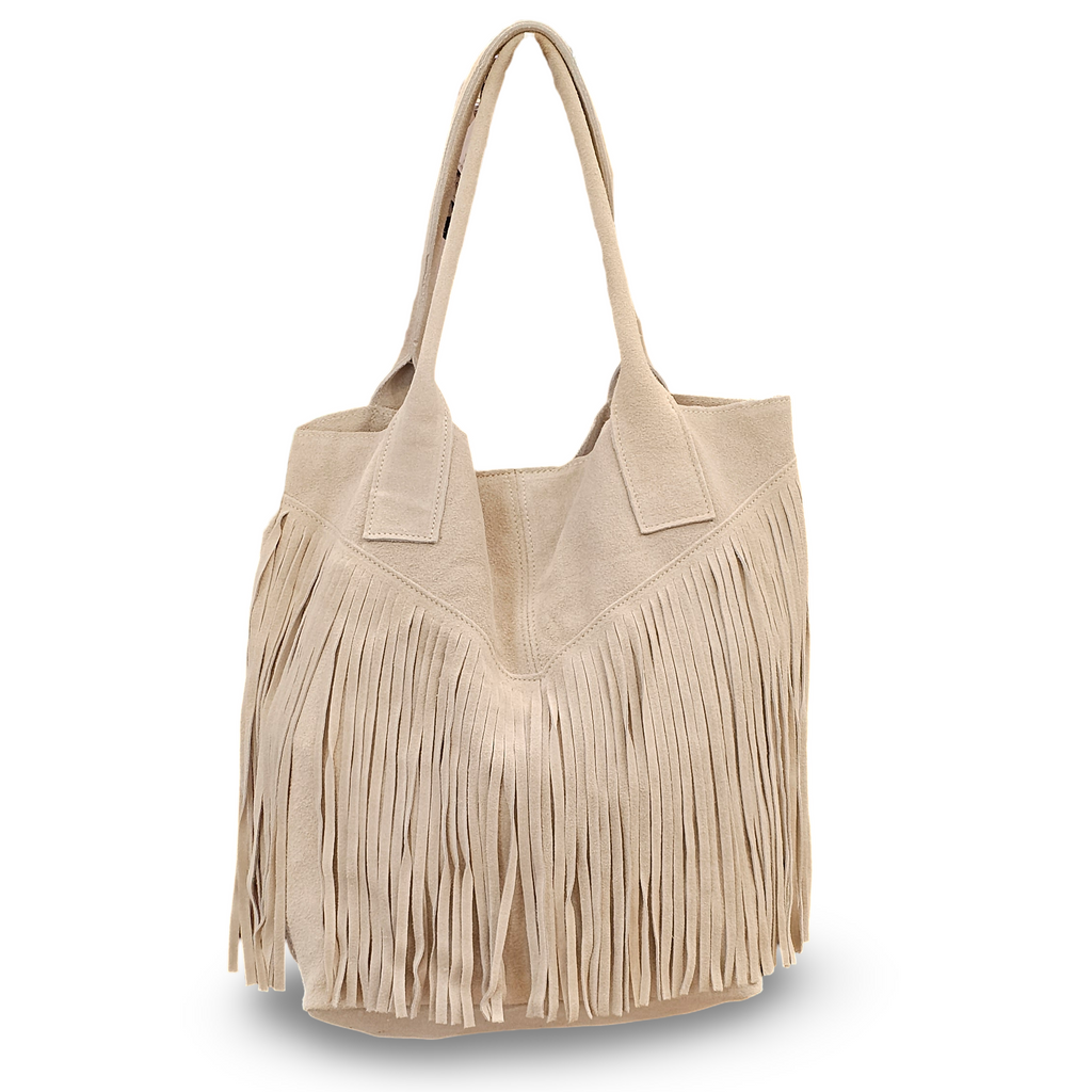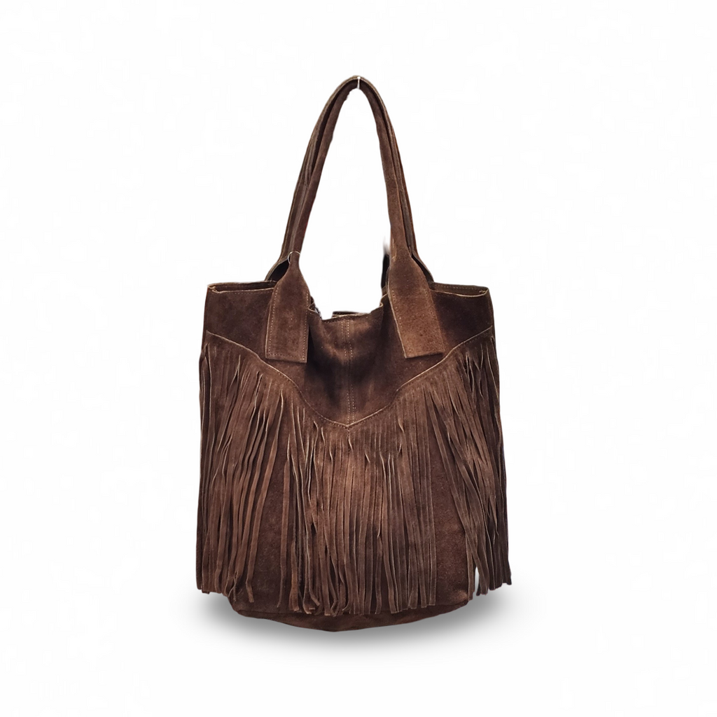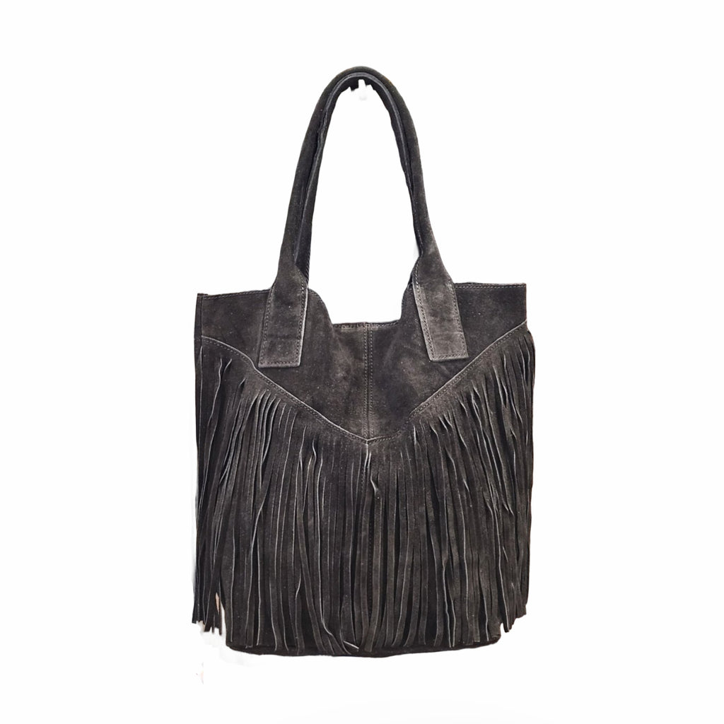 Borsa in vero camoscio con Frange applicate anteriormente. Chiusura a bottone calamitato e dotata di una taschina con cerniera.