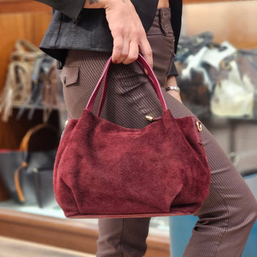 Borsa in camoscio Made in Italy, completa di tracolla regolabile e tasca interna con chiusura a zip.