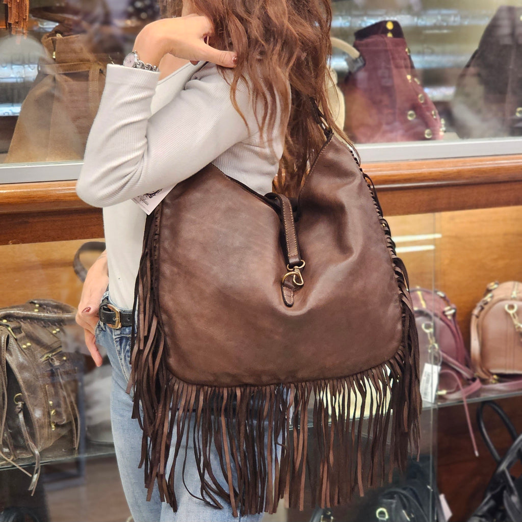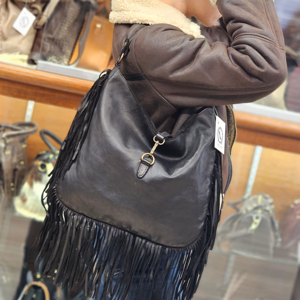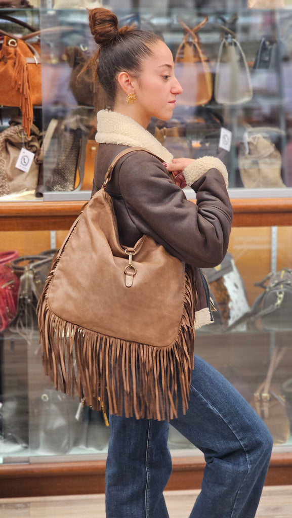 Borsa in vera pelle Toscana delavata. Completa di tracolla regolabile inclusa. Impreziosita da frange per un look più sofisticato. La chiusura è con cerniera e fibbia.