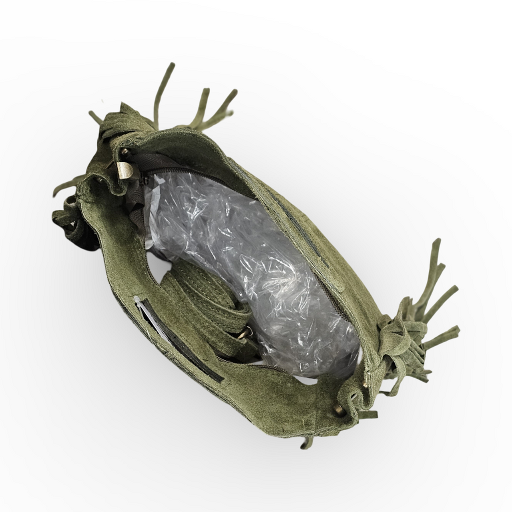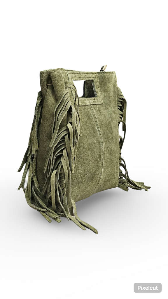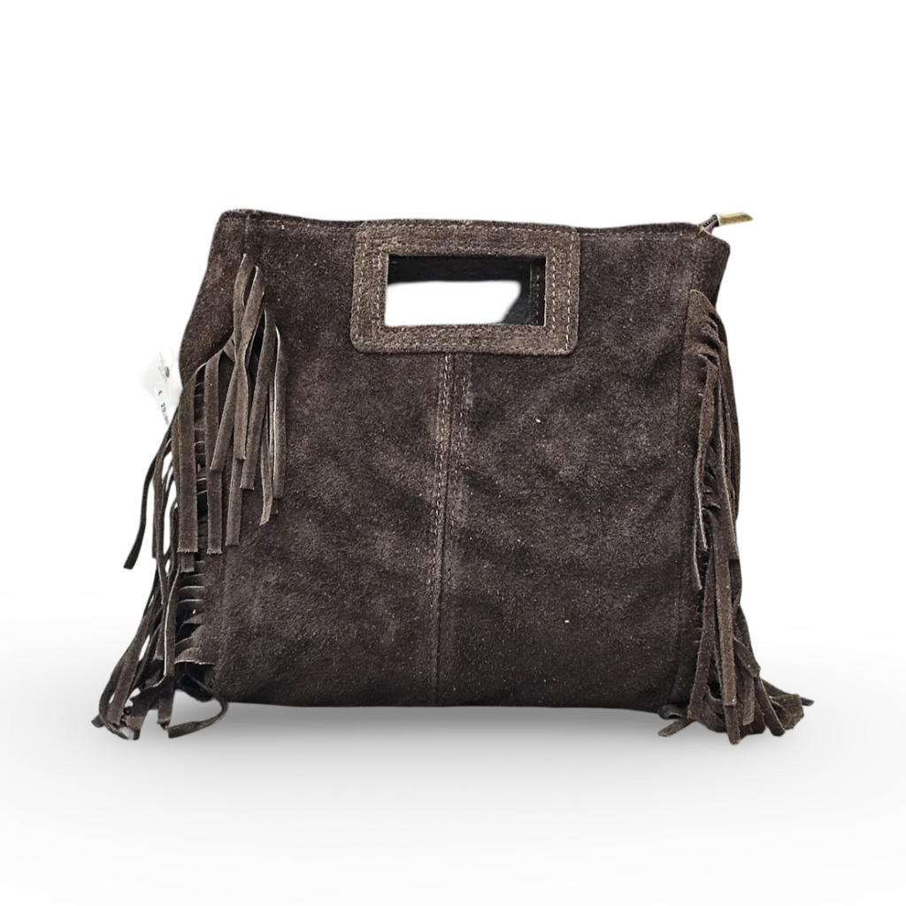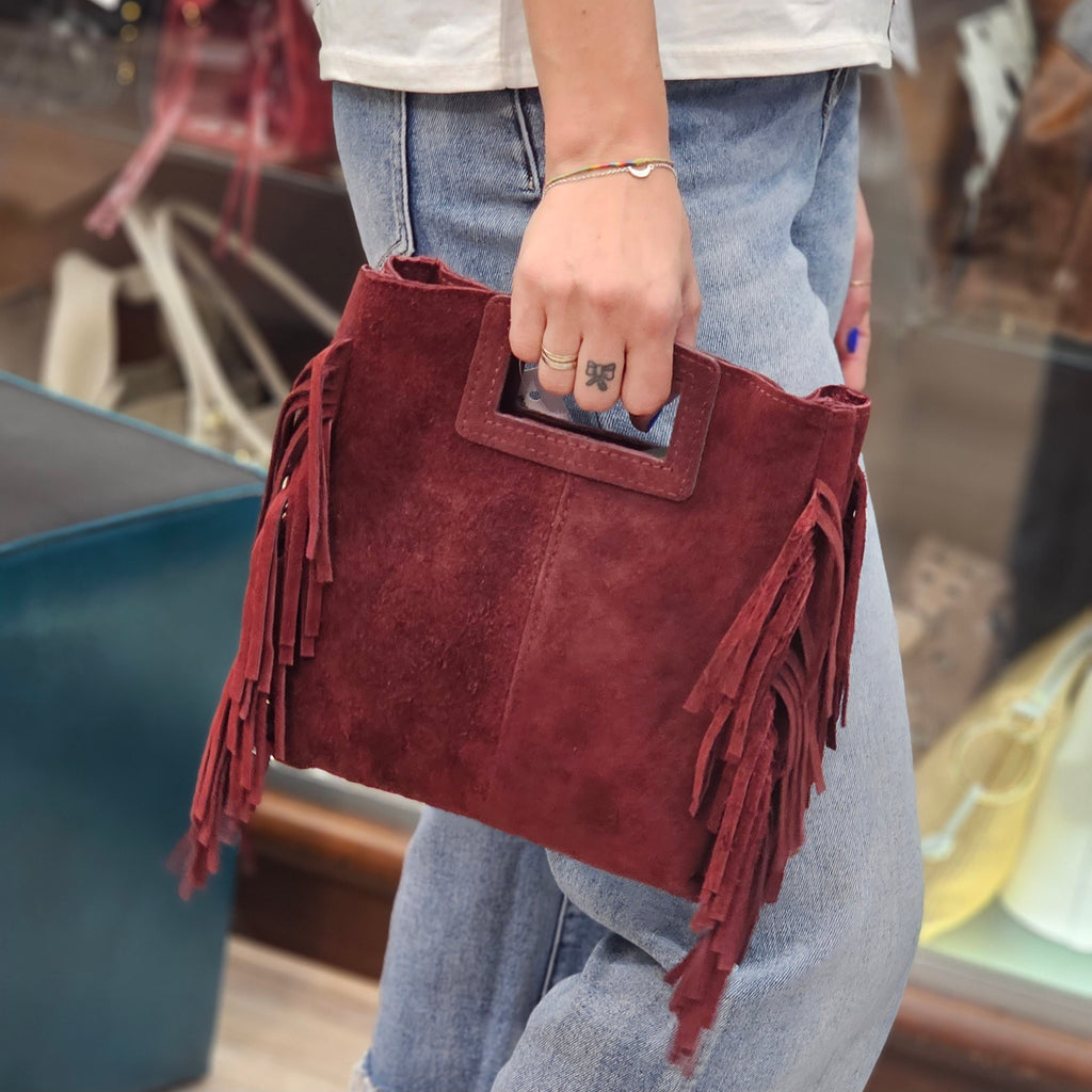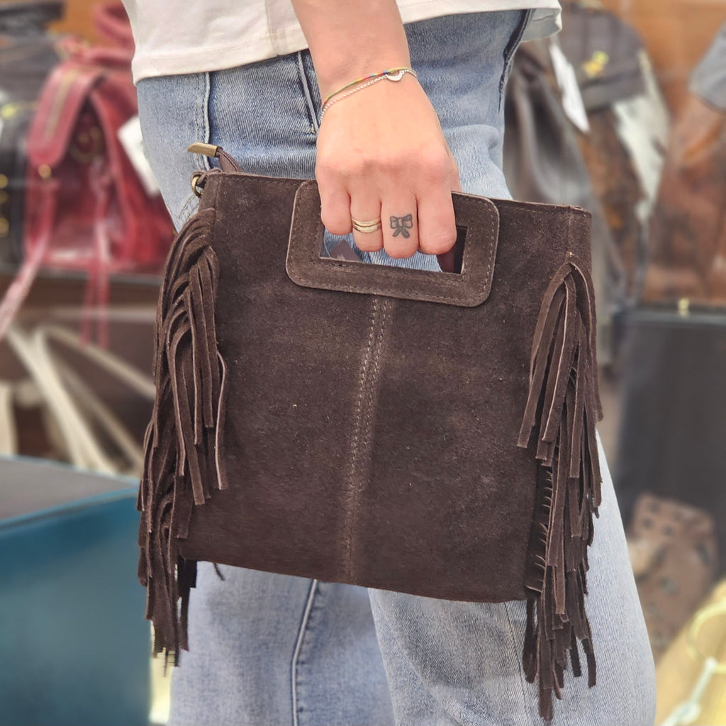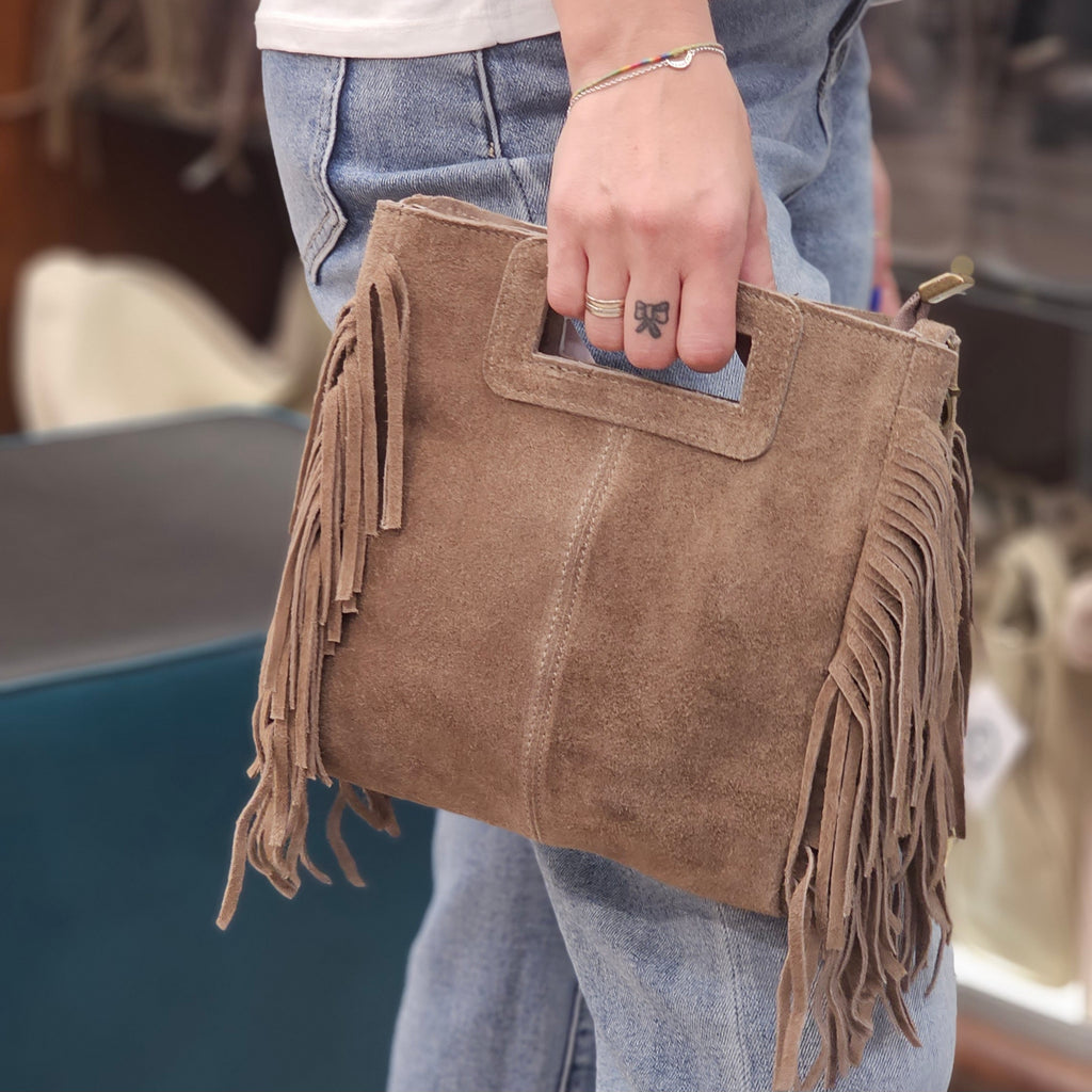 Borsa in vero camoscio, chiusura a cerniera, con tracolla aggiuntiva regolabile
