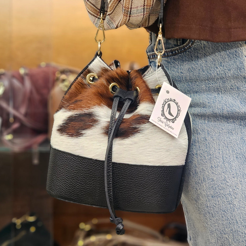 Borsa in vera pelle e cavallino animalier. Dotata di tracolla regolabile inclusa. Per misure e ulteriori dettagli scrivici direttamente in chat: saremo felici di darti tutte le info!