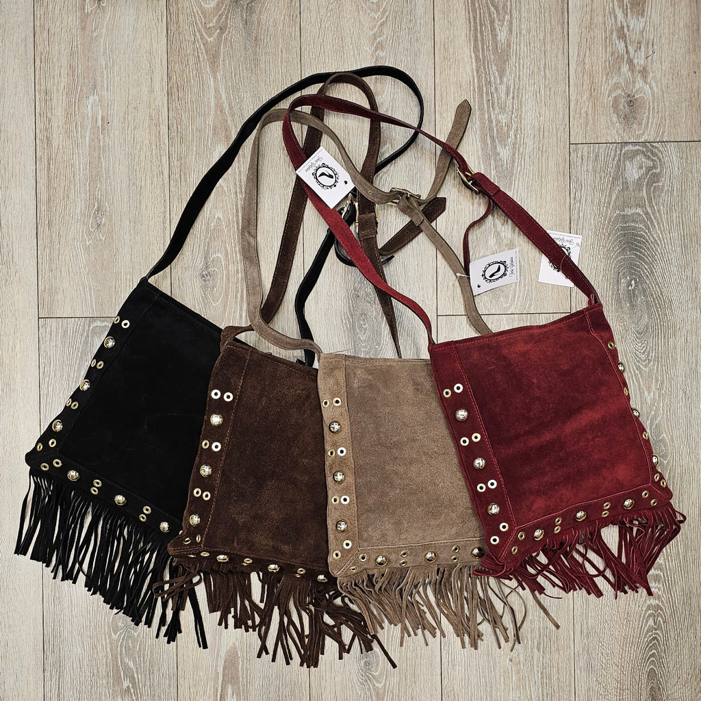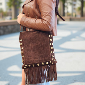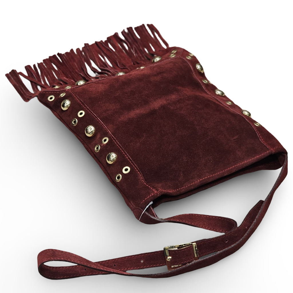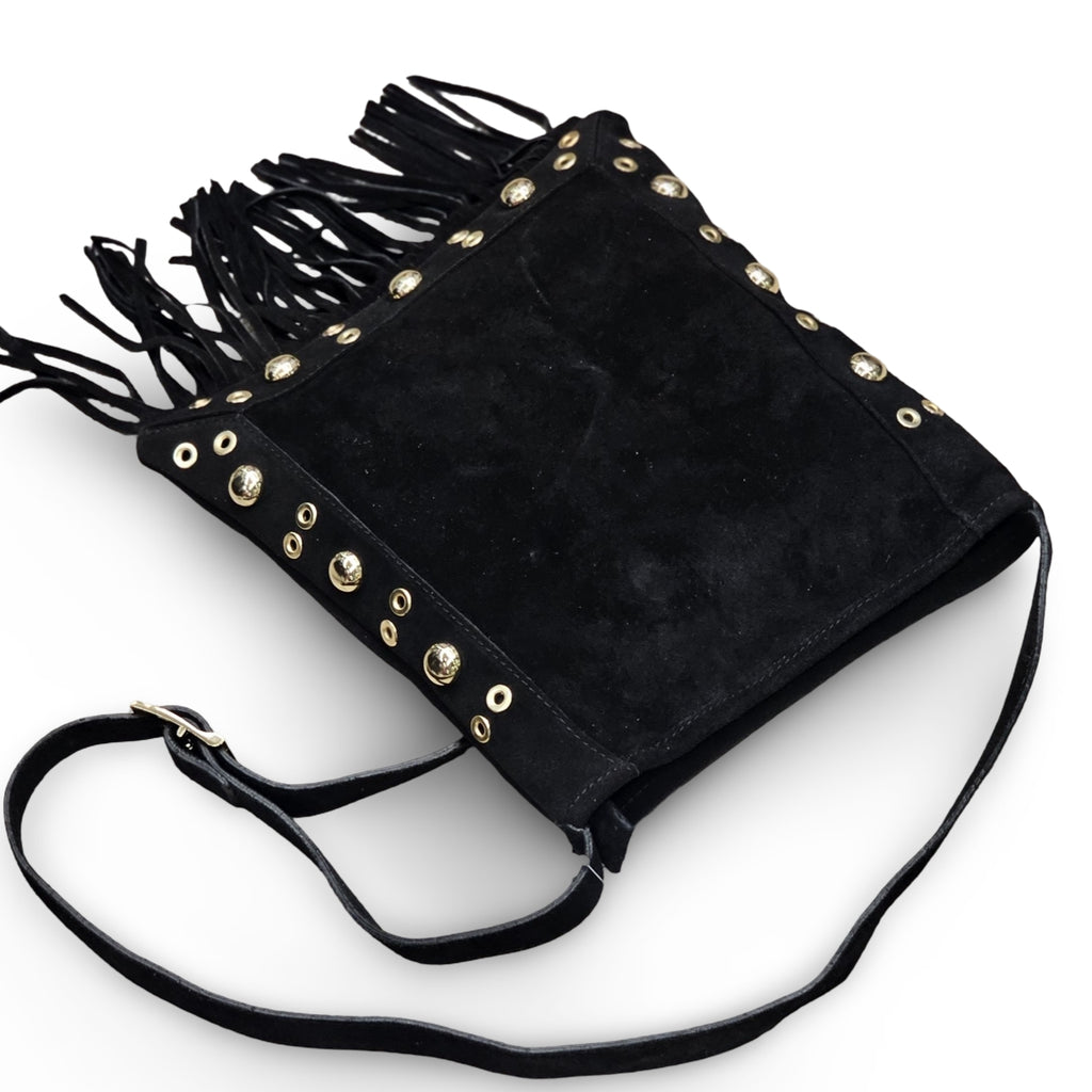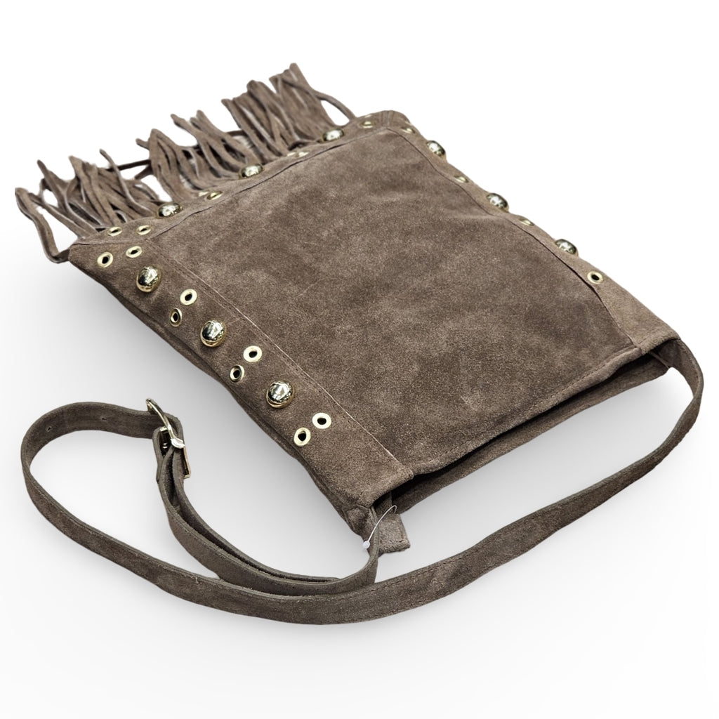 Borsa in camoscio Made in Italy, arricchita da borchie, con pratica chiusura a cerniera e tracolla regolabile.