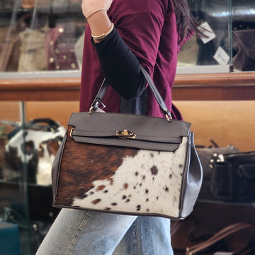 Borsa in pelle Made in italy con inserto frontale in cavallino muccato, dotata di tracolla e tasca interna con chiusura a zip.