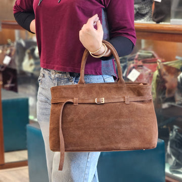 Borsa grande in camoscio Made in Italy, con chiusura a cerniera e tracolla aggiuntiva regolabile inclusa.