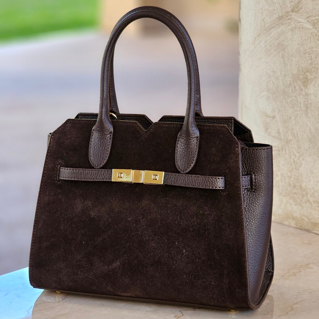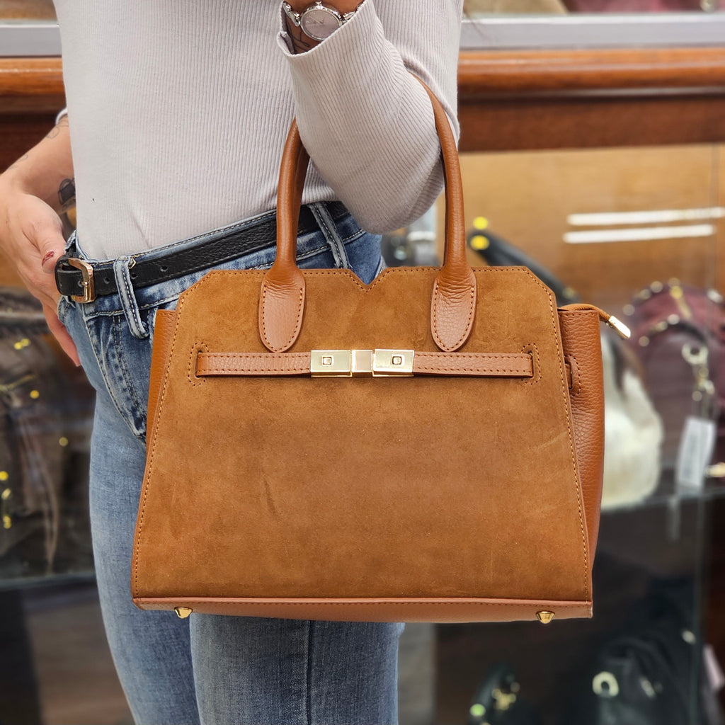 Borsa in Vera pelle e Camoscio Made in Italy. Chiusura con cerniera e tracolla aggiuntiva regolabile .