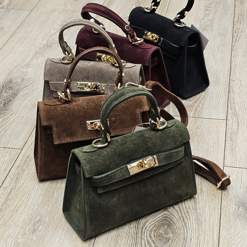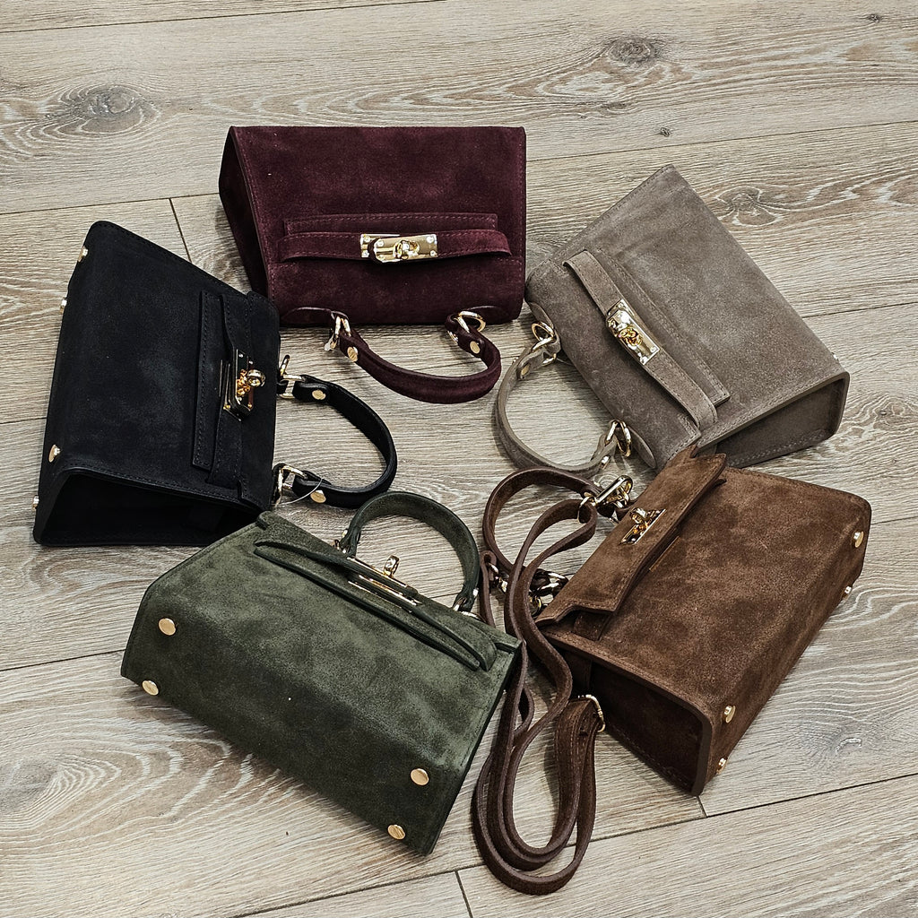 Borsa in camoscio Made in Italy, completa di tracolla regolabile e tasca interna con chiusura a zip.