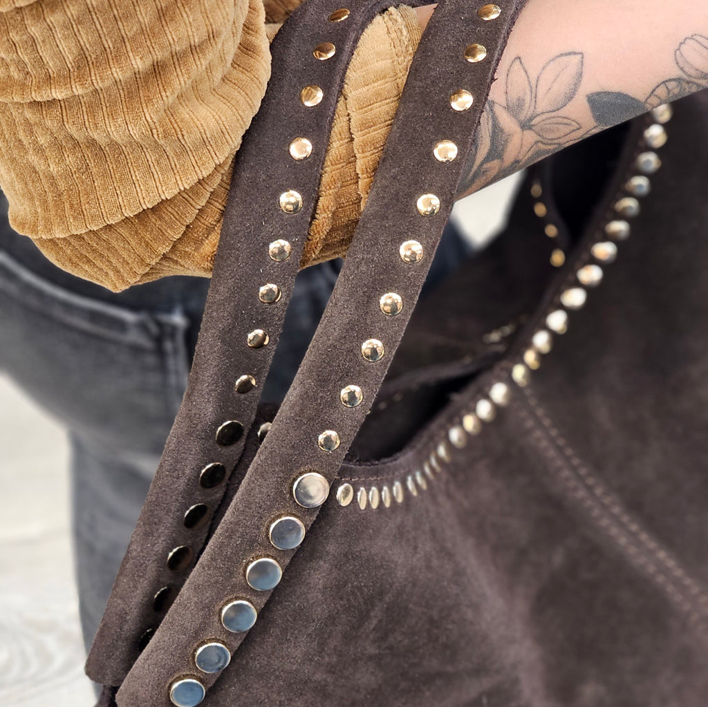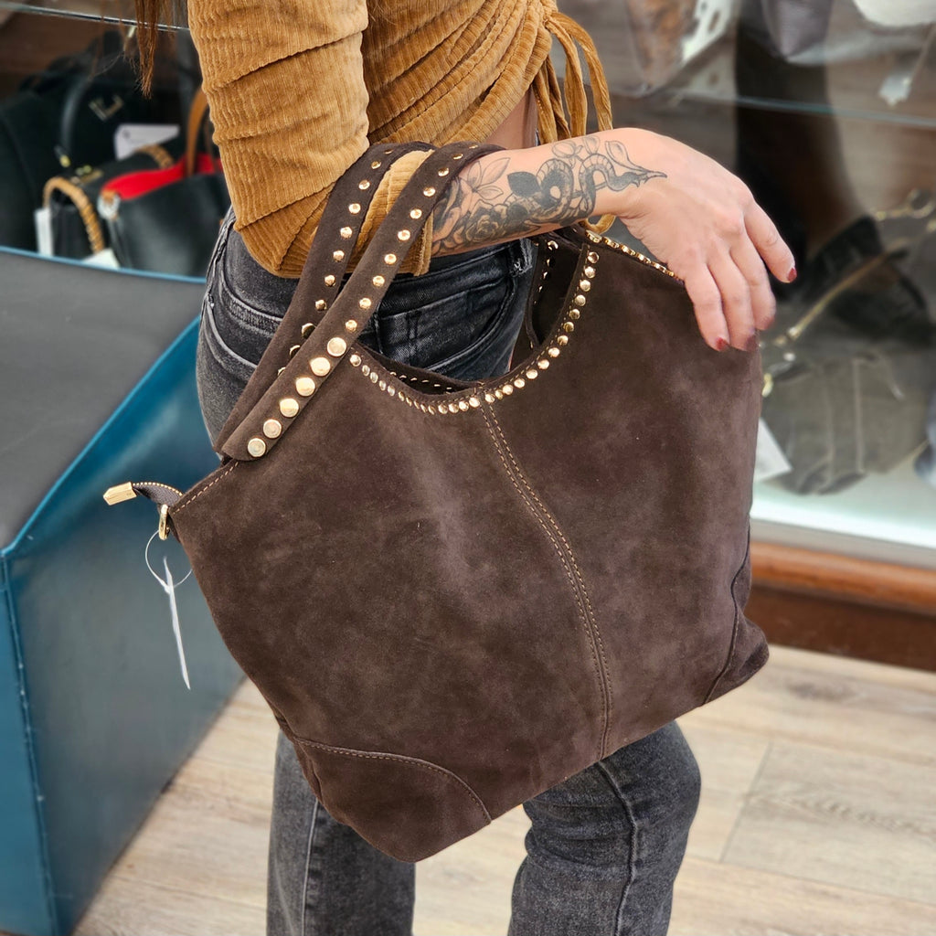 Elegante e versatile, realizzata in morbido camoscio e impreziosita da borchiette color oro.
