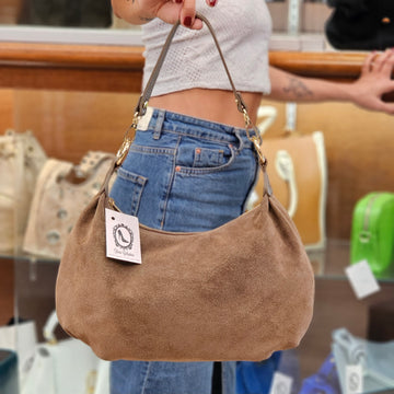 Borsa in camoscio Made in Italy. Chiusura a cerniera. Completa di tracolla regolabile e di tasca con cerniera sia esterna che interna