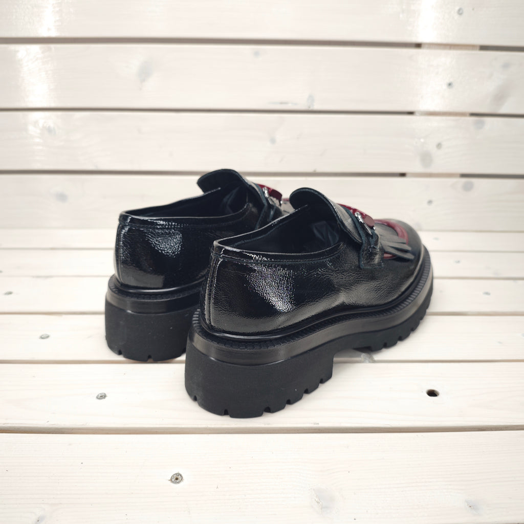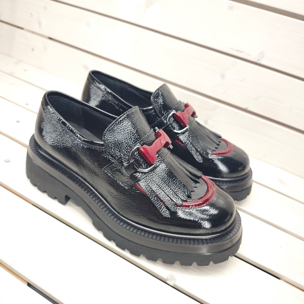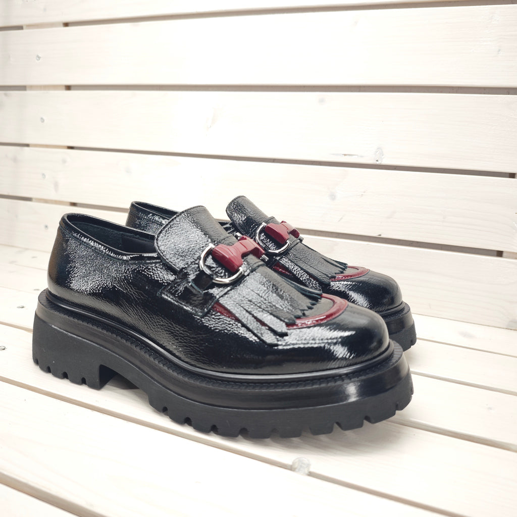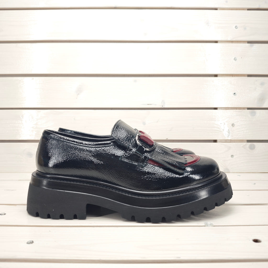 Mocassino in nappa laccata, pelle nera con suola platform da 4 cm bicolor; l'accessorio in tinta con la cucitura della mascherina completa la grinta di questa calzatura