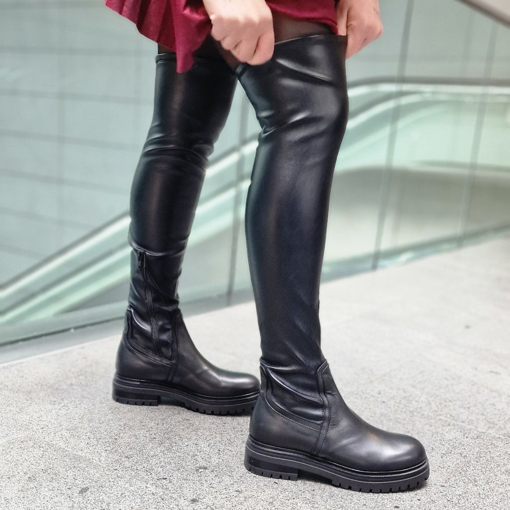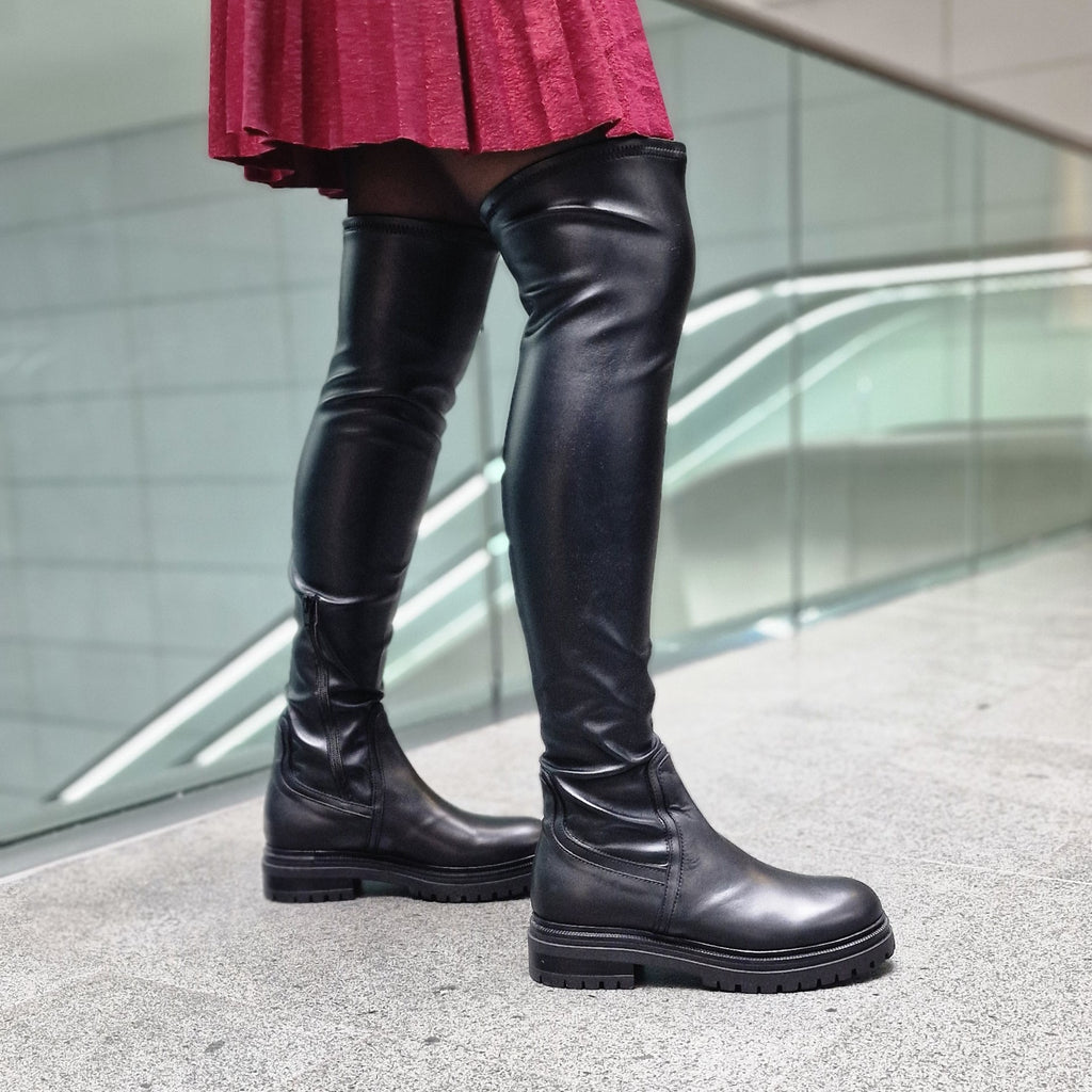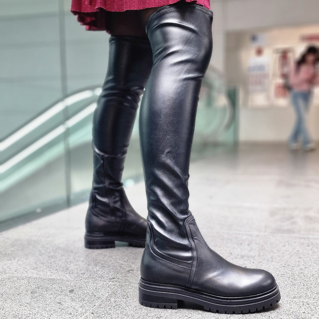 Stivale sopra al ginocchio in pelle con gambale elasticizzato e mezza cerniera per la calzata.