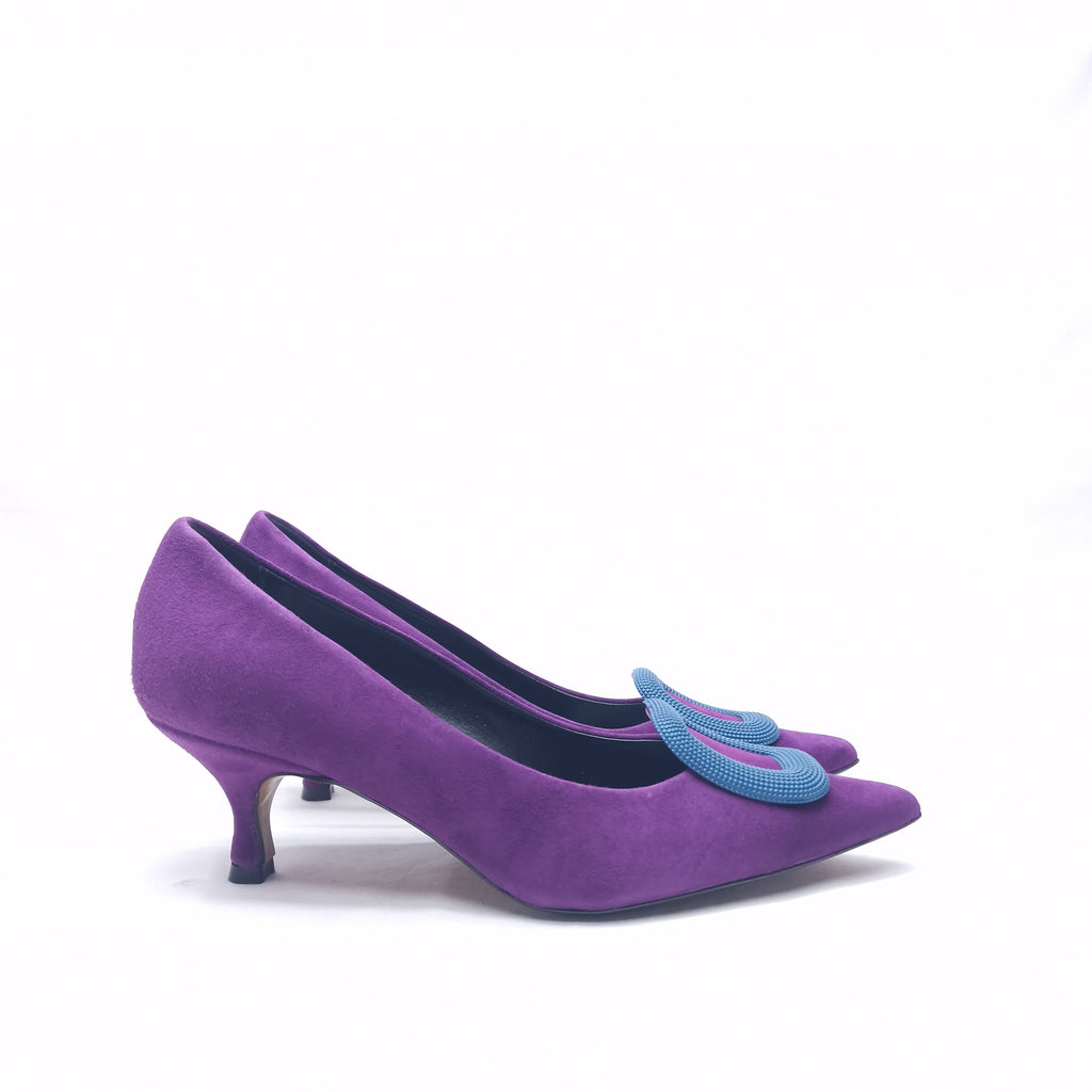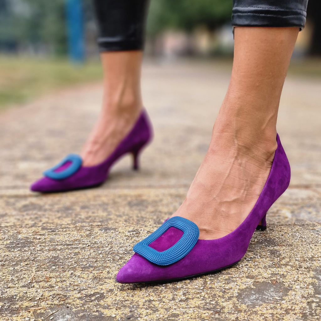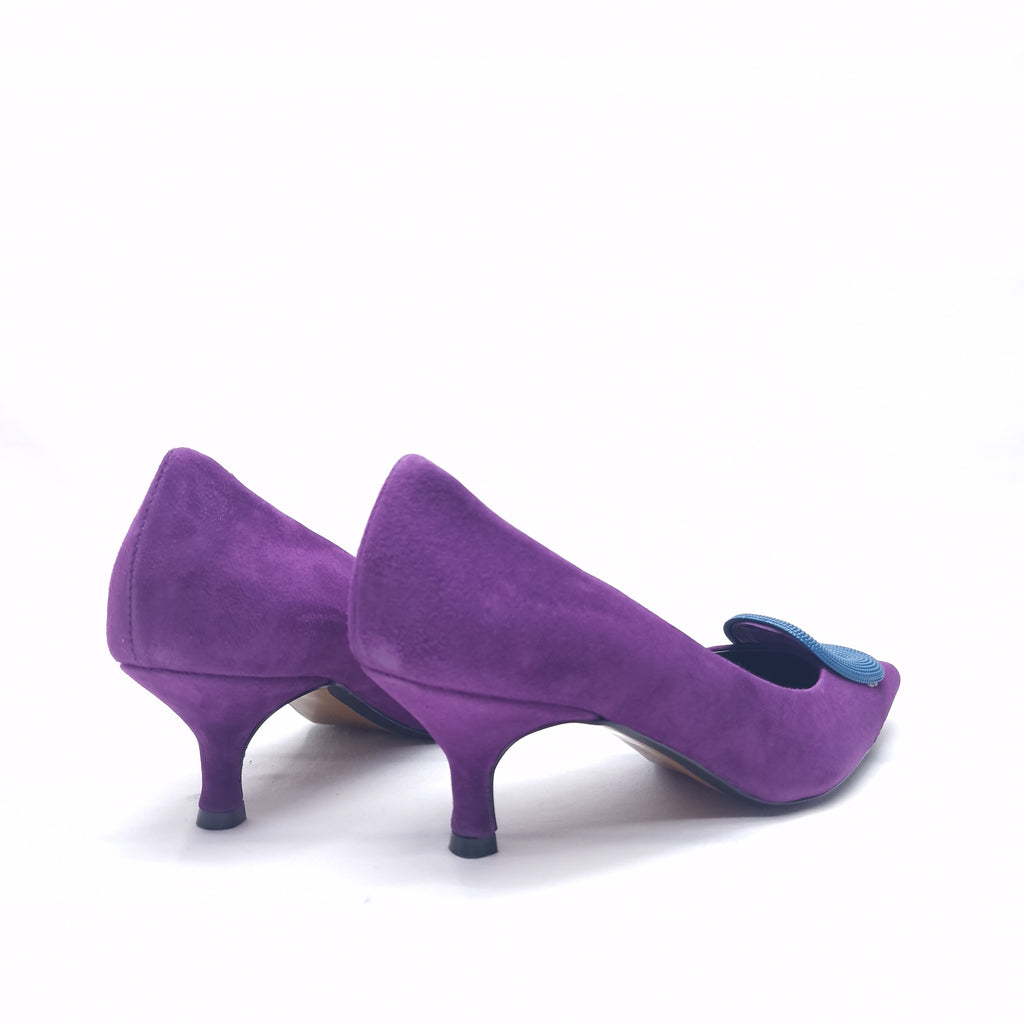 Decollètè in vera pelle interna ed esterna con accessorio in punta e tacco rivestito da 5cm; prodotto realizzato interamente in Italia da maestri artigiani, calzata regolare