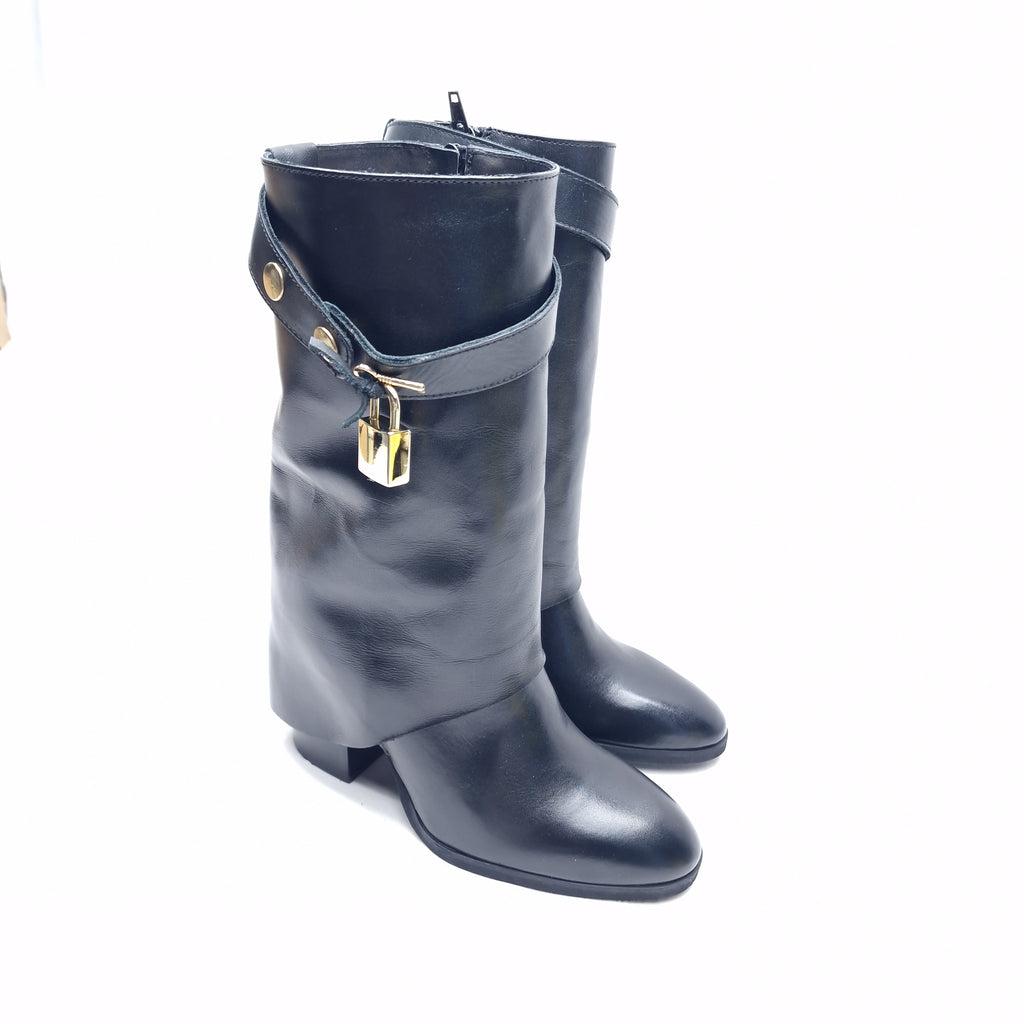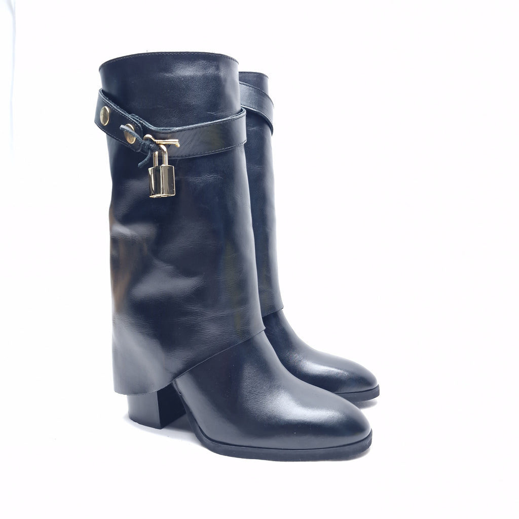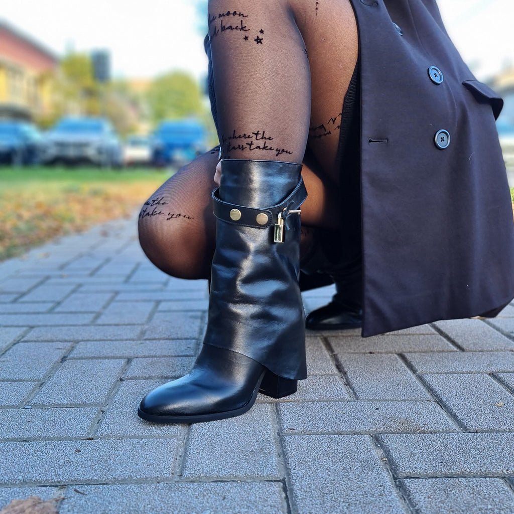 Stivale a 3/4 in vera pelle con ghetta e accessorio removibile lucchetto-chiave; la particolarità di questo stivale è racchiusa nel fatto che il tacco da 9 cm è semicoperto dalla ghetta trasversale sul tallone; calzata regolare
