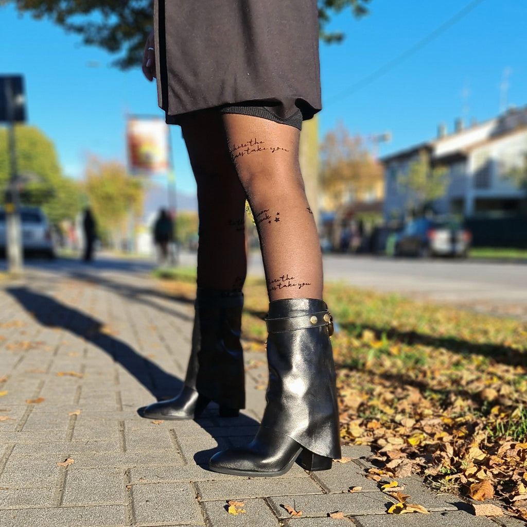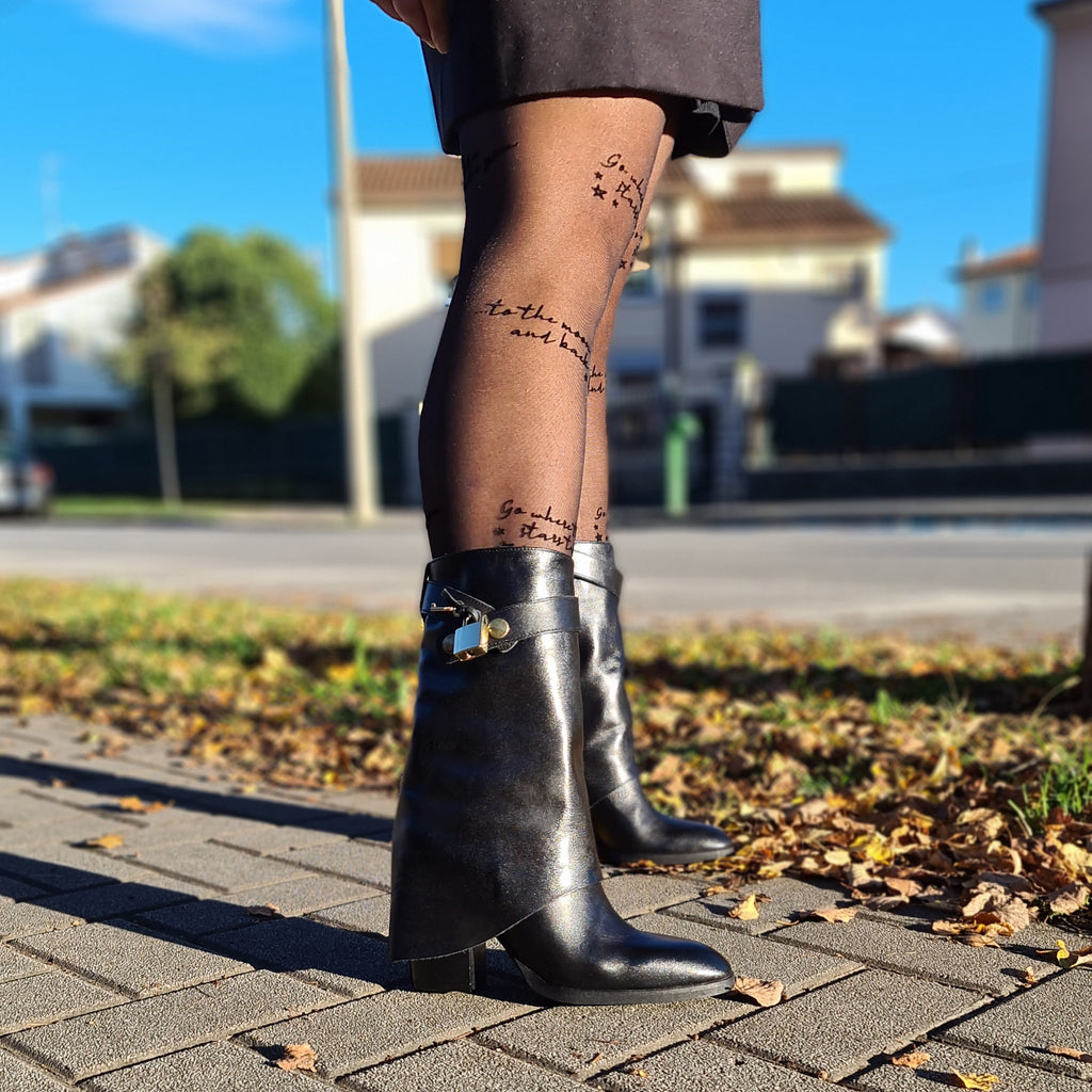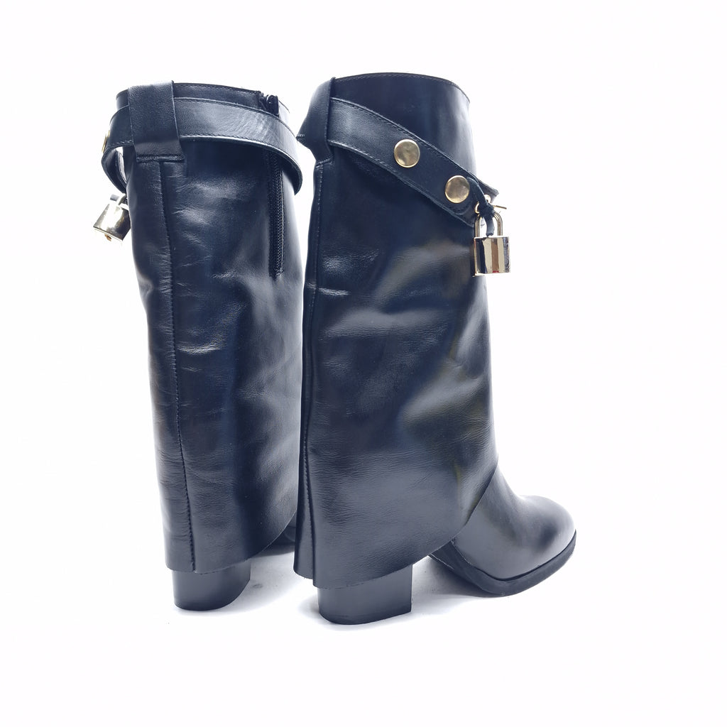 Stivale a 3/4 in vera pelle con ghetta e accessorio removibile lucchetto-chiave; la particolarità di questo stivale è racchiusa nel fatto che il tacco da 9 cm è semicoperto dalla ghetta trasversale sul tallone; calzata regolare