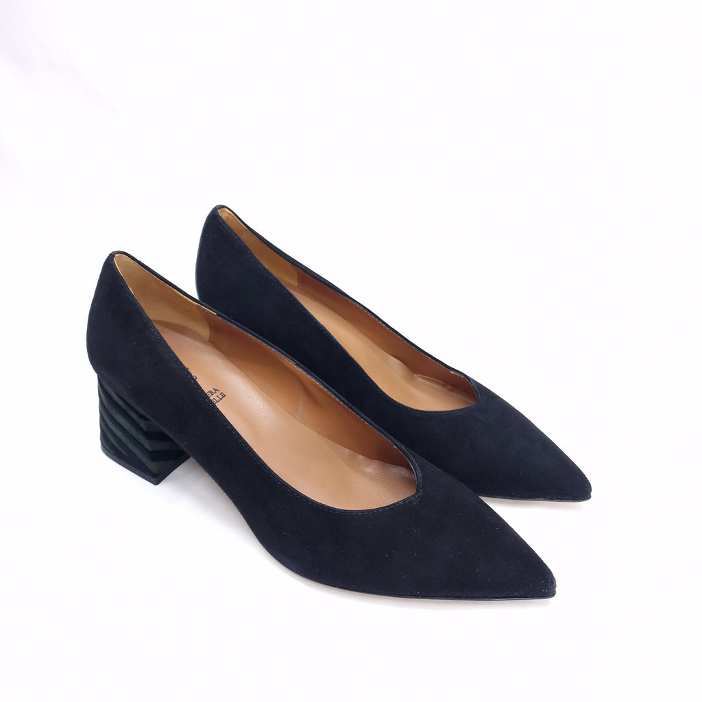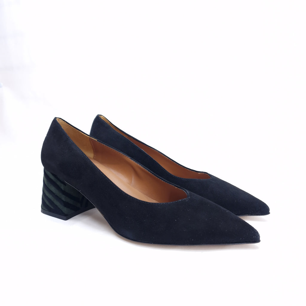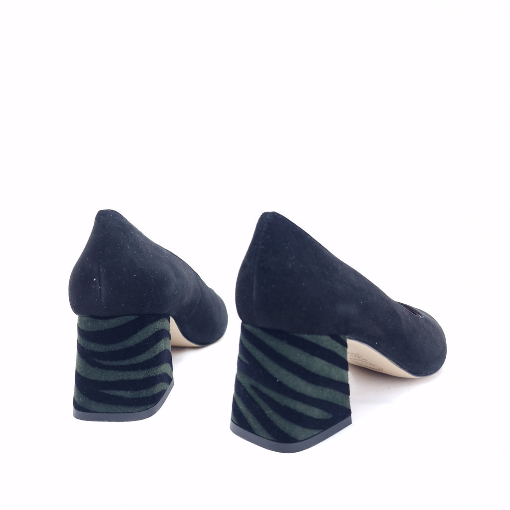 Decollètè in camoscio con tacco zebrato nero verde, a punta, tacco 5 cm.