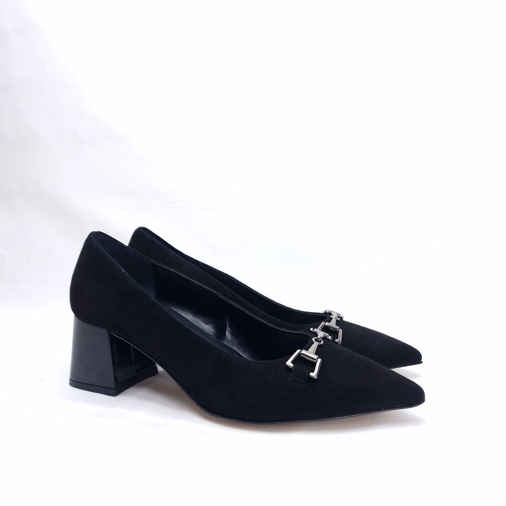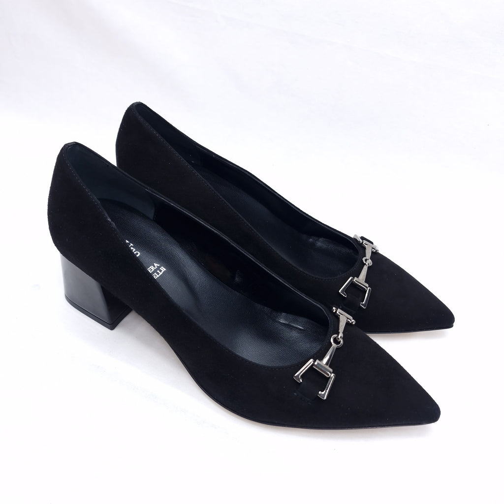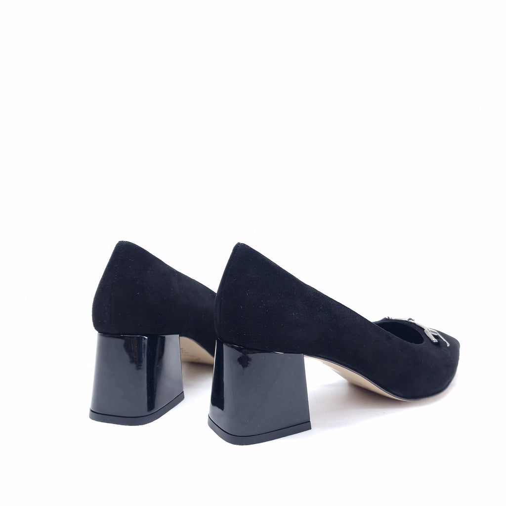 Decollètè in camoscio con accessorio a morsetto, punta, tacco 5 cm.
