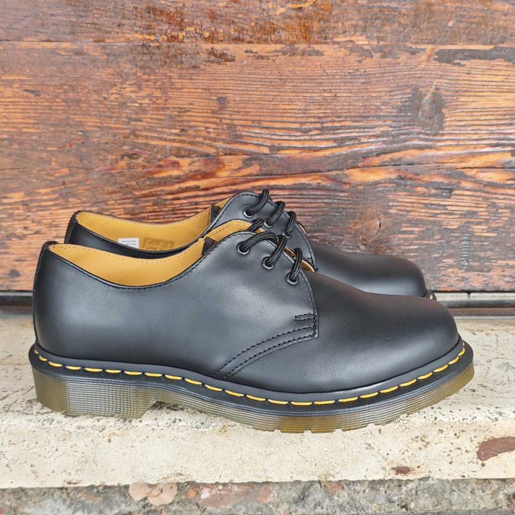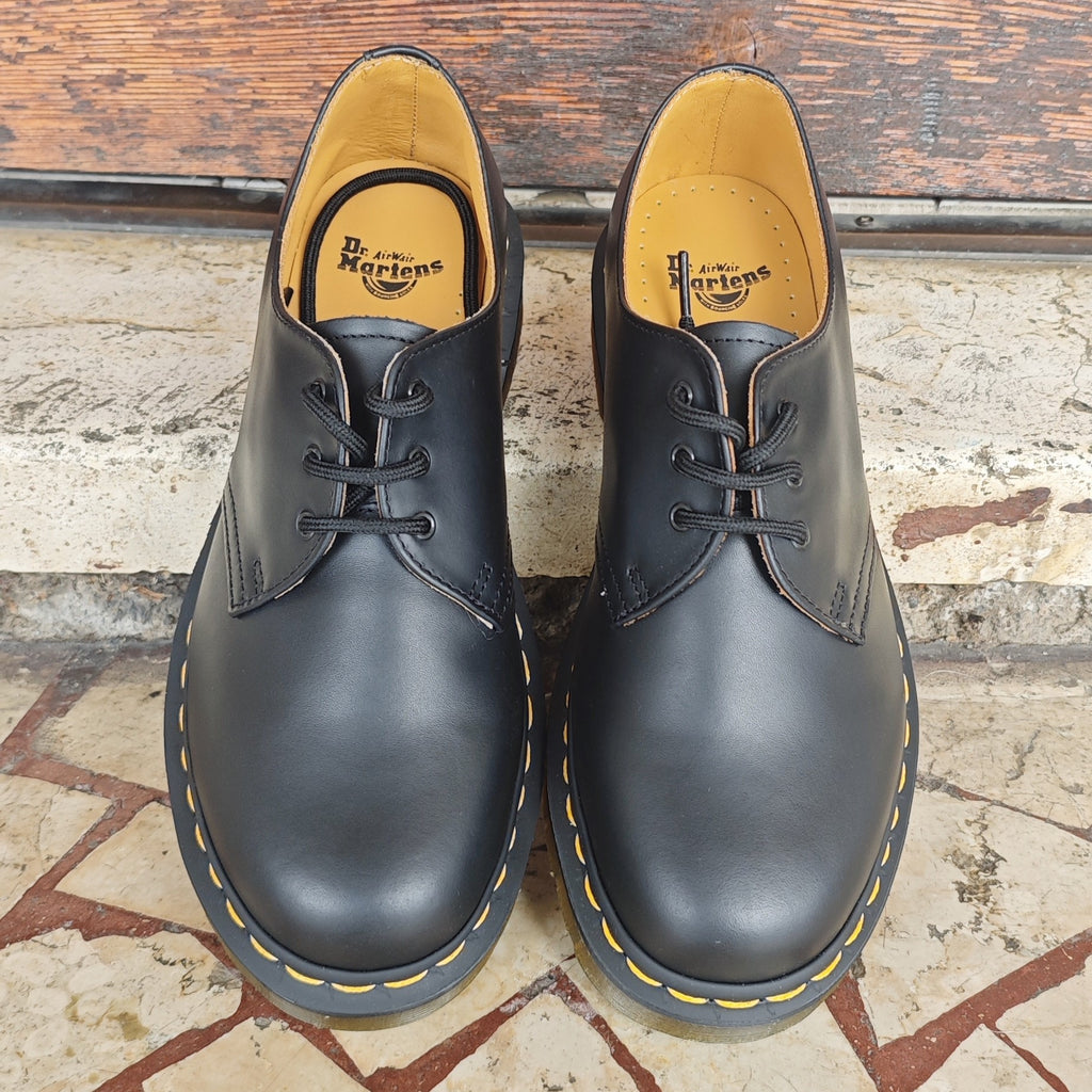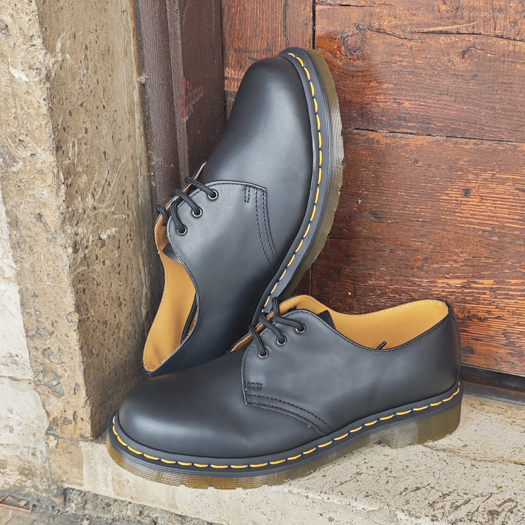 1461 è l’originale stringata Dottor Martens, ma in nappa. Il suo DNA immediatamente riconoscibile presenta 3 occhielli, la classica pelle Dr. Martens Smooth nera, bordi scanalati, una fettuccia posteriore con logo, cuciture gialle e una confortevole suola a cuscinetto.