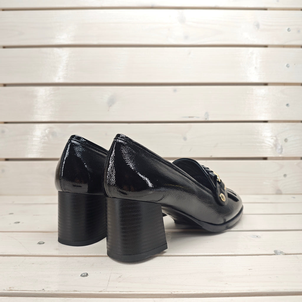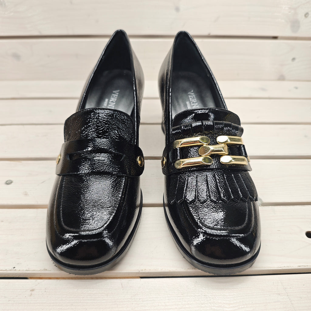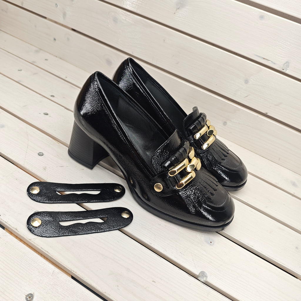Mocassino in naplak con accessorio intercambiabile tramite bottoni automatici, vera pelle interna ed esterna con tacco da 6 cm; produzione interamente Italiana.