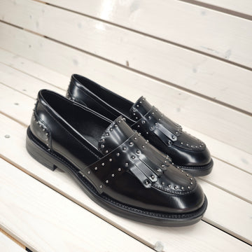 Mocassino in vera pelle abrasivata con frangetta e borchiette satinate