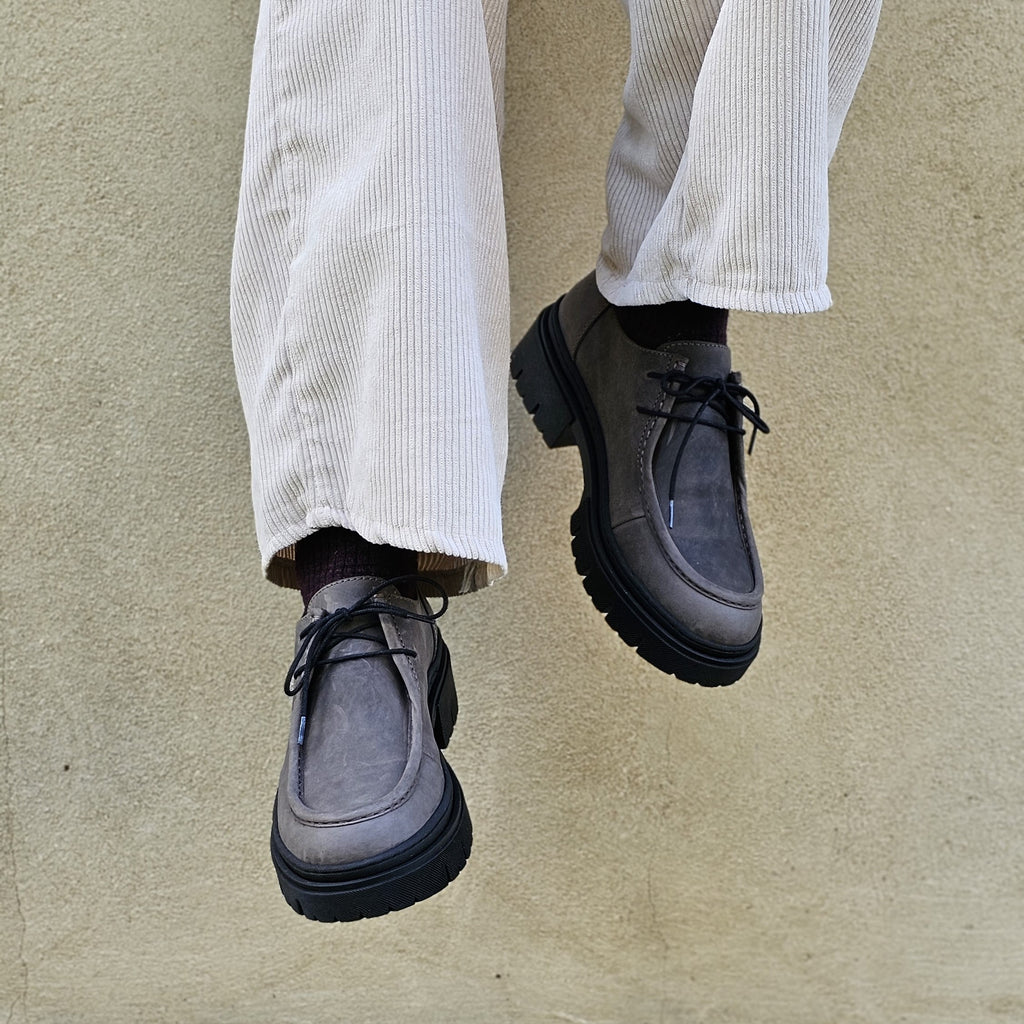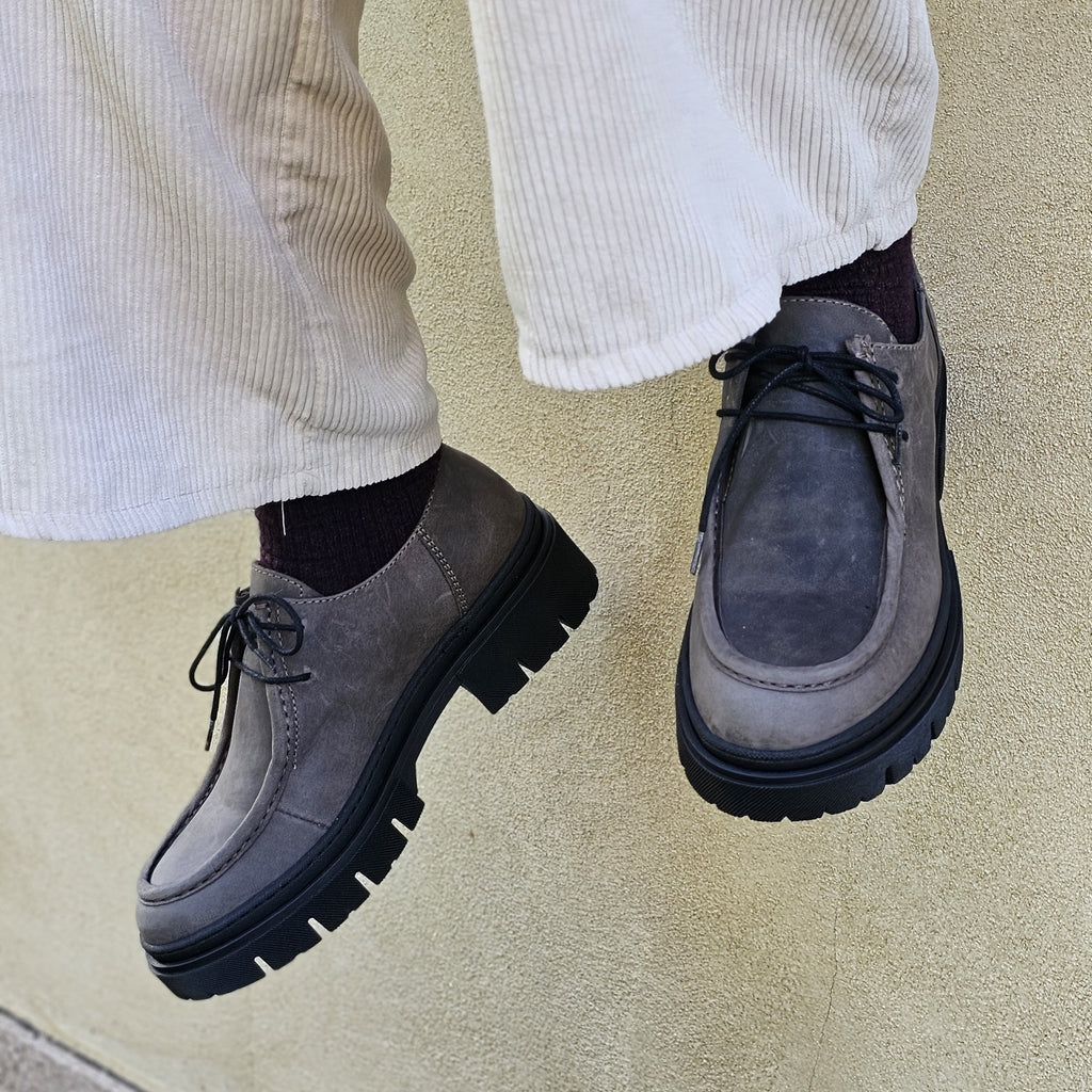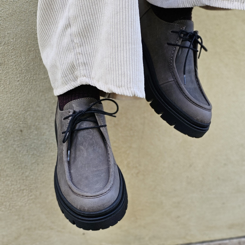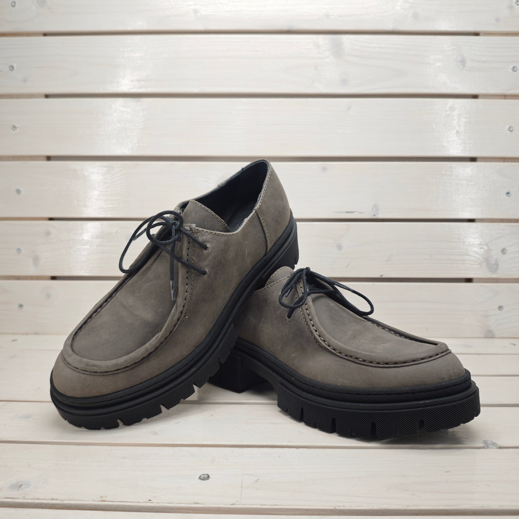 Mocassino stringato in nubuk ingrassato in vera pelle interna ed esterna con suola carrarmato da 4 cm