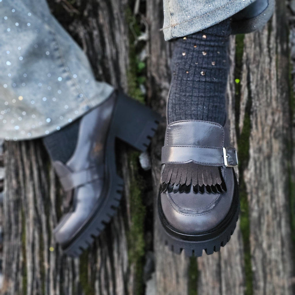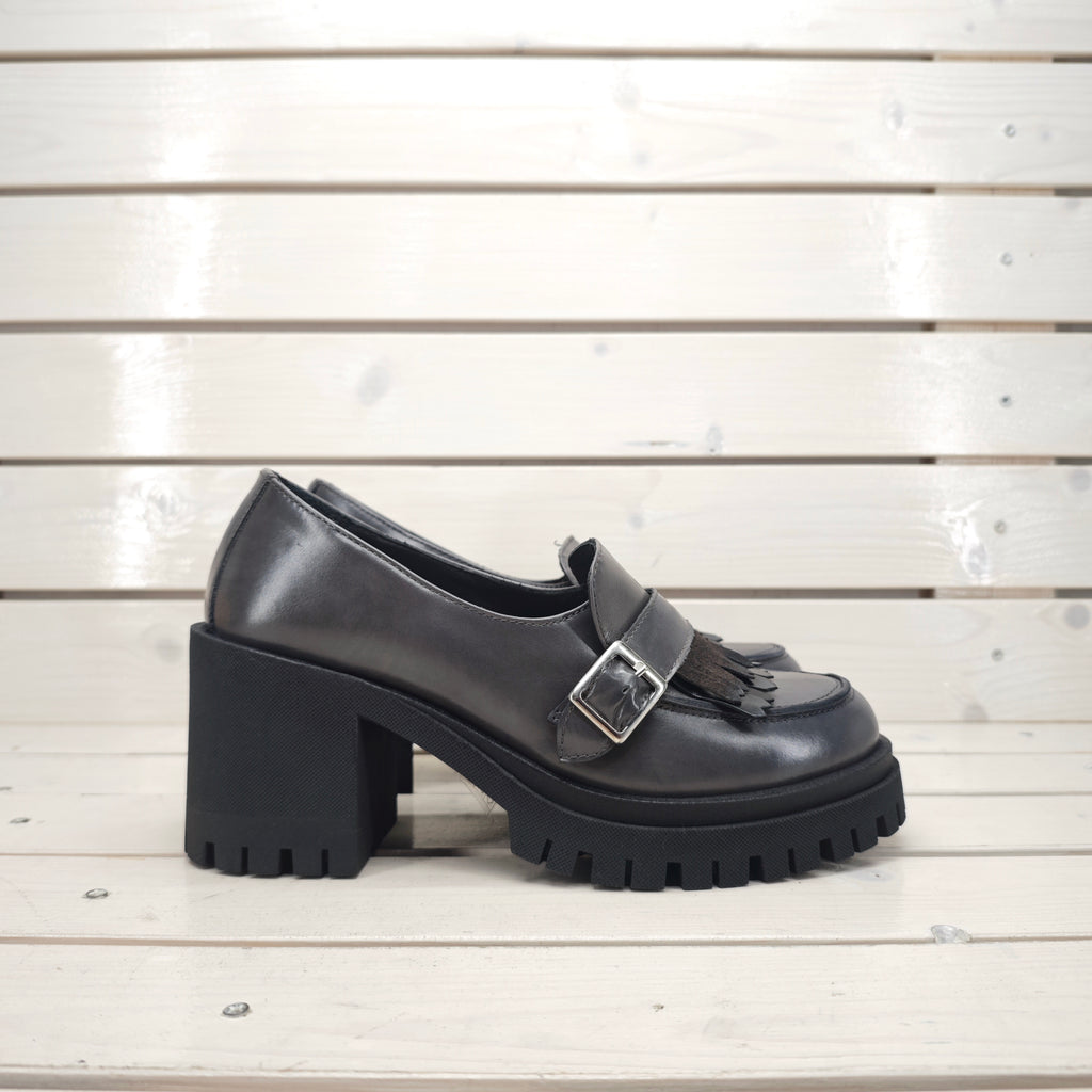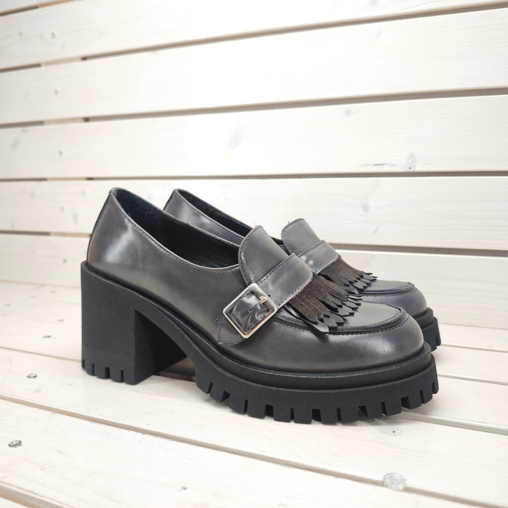 Mocassino gommato con tacco da 8 cm e plateau da 3cm con frangetta e fibbietta in nubuk, vera pelle interna ed esterna.