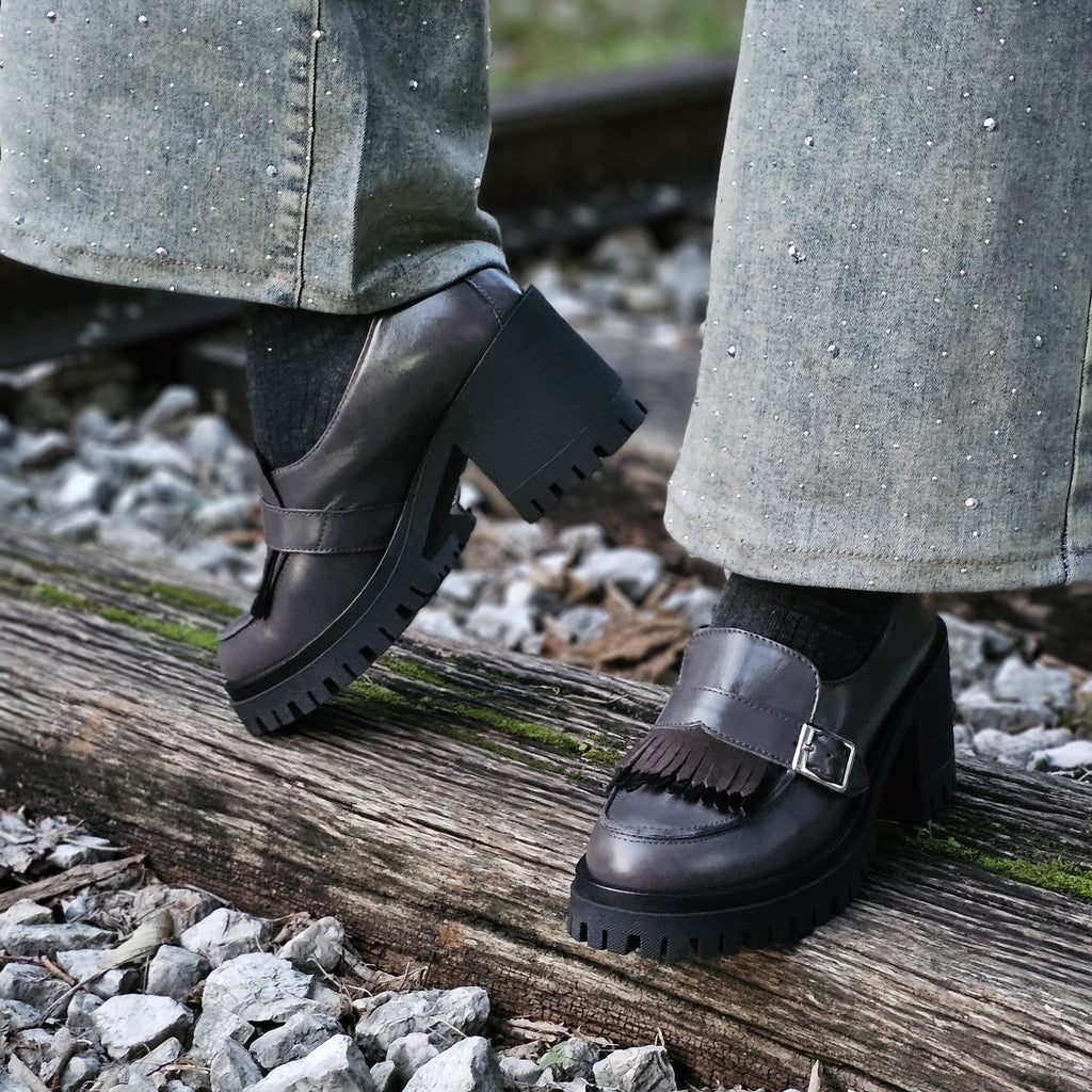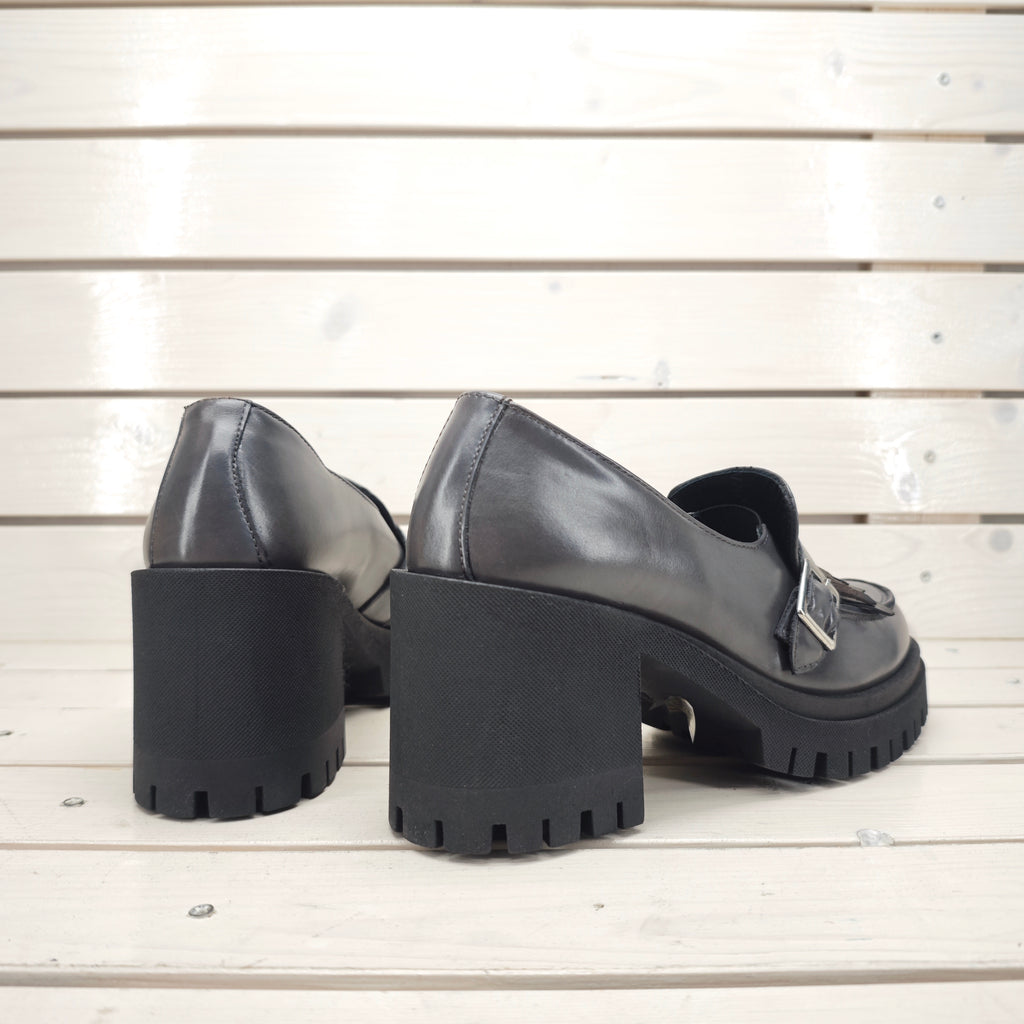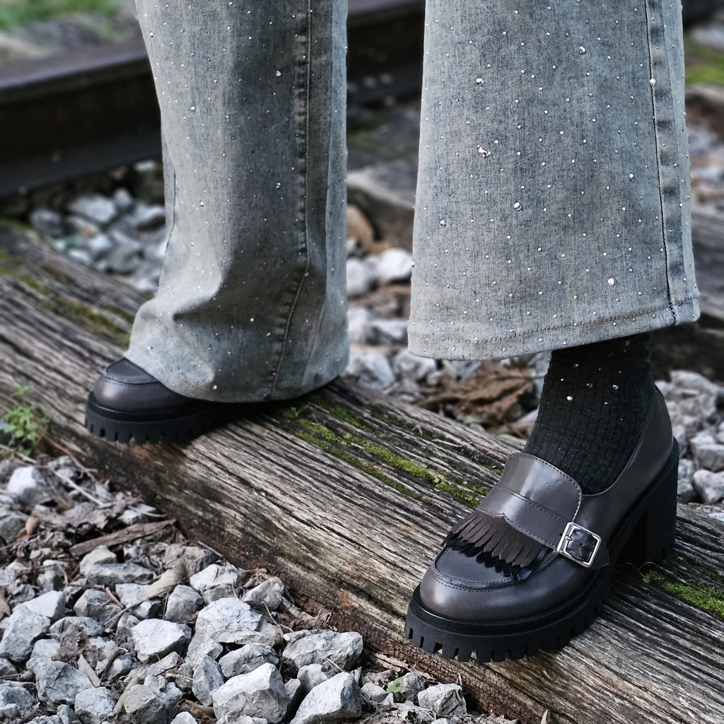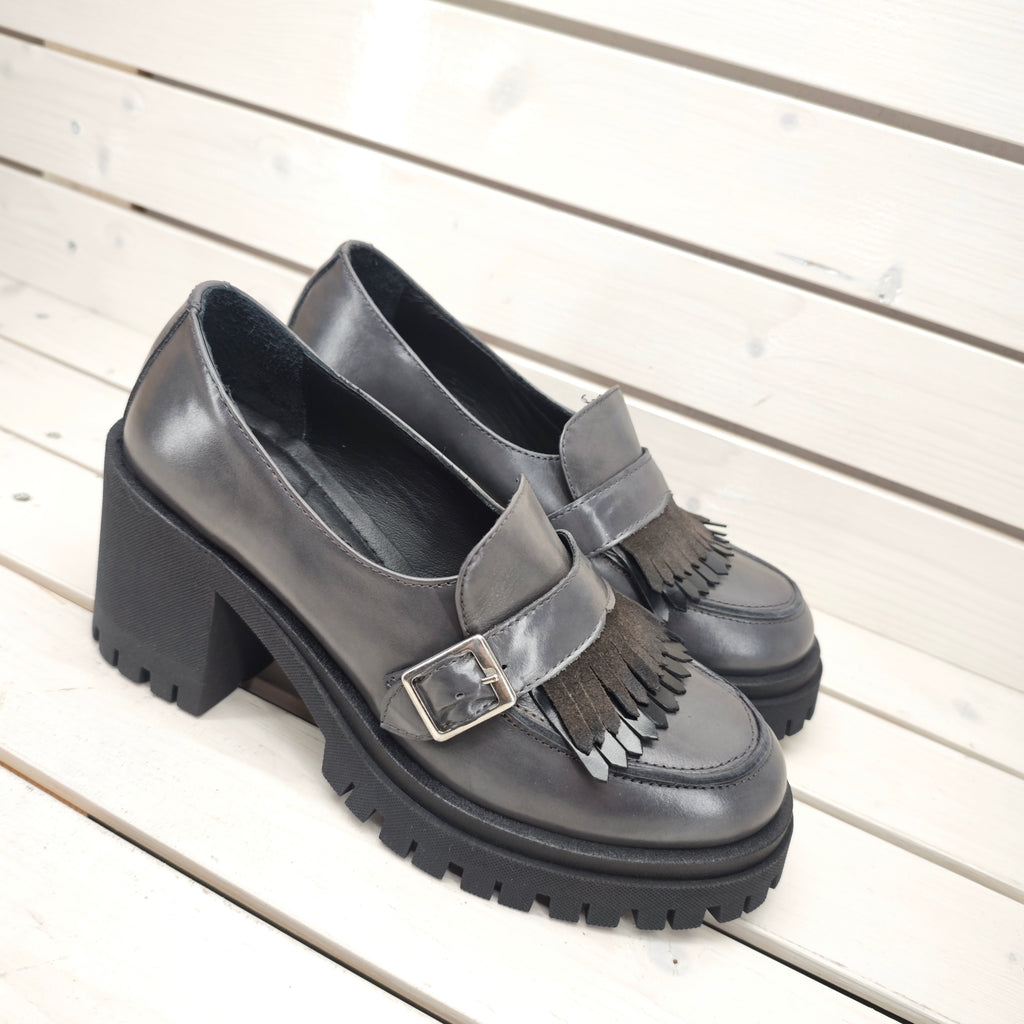 Mocassino gommato con tacco da 8 cm e plateau da 3cm con frangetta e fibbietta in nubuk, vera pelle interna ed esterna.