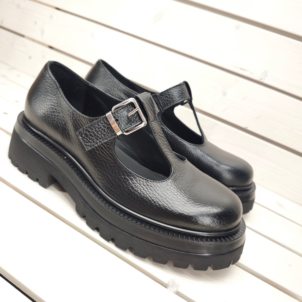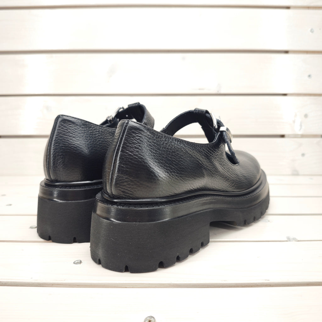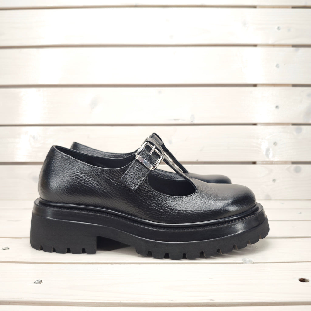 Mocassino bebè in nappa bottolata, pelle nera con suola platform da 4 cm; la fibbietta di allacciatura sul collo del piede completa la grinta di questa calzatura