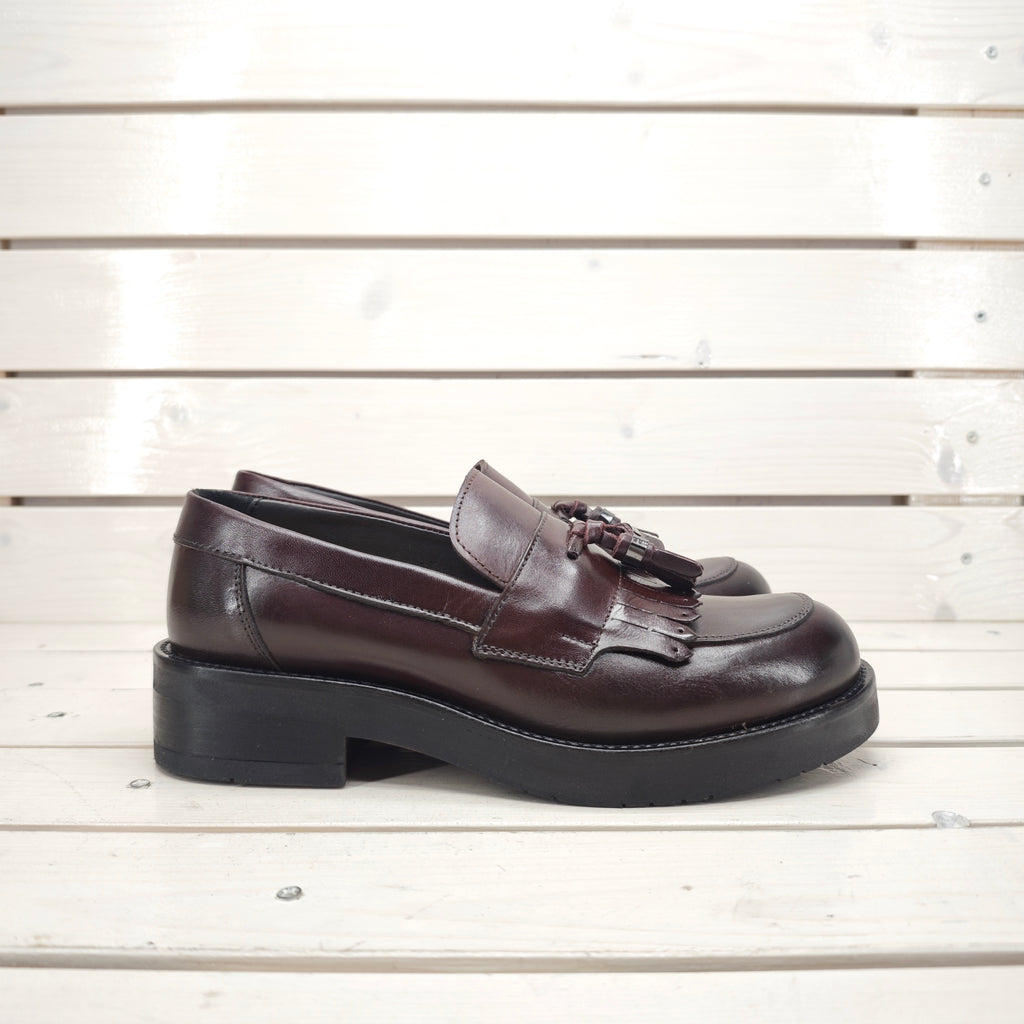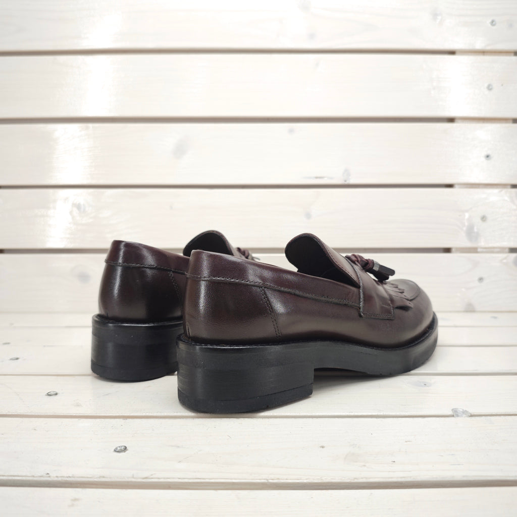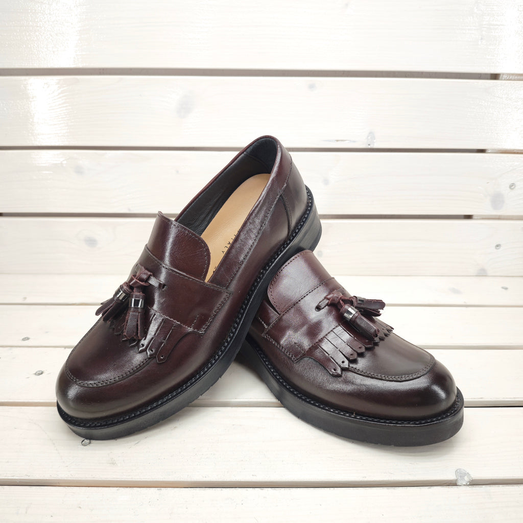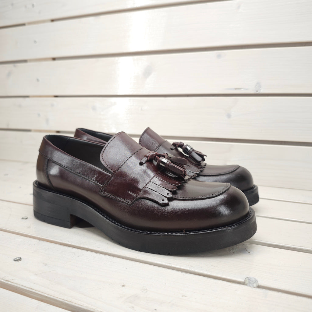 Mocassino con frangia e nappina in vera pelle interna ed esterna, suola da 3 cm
