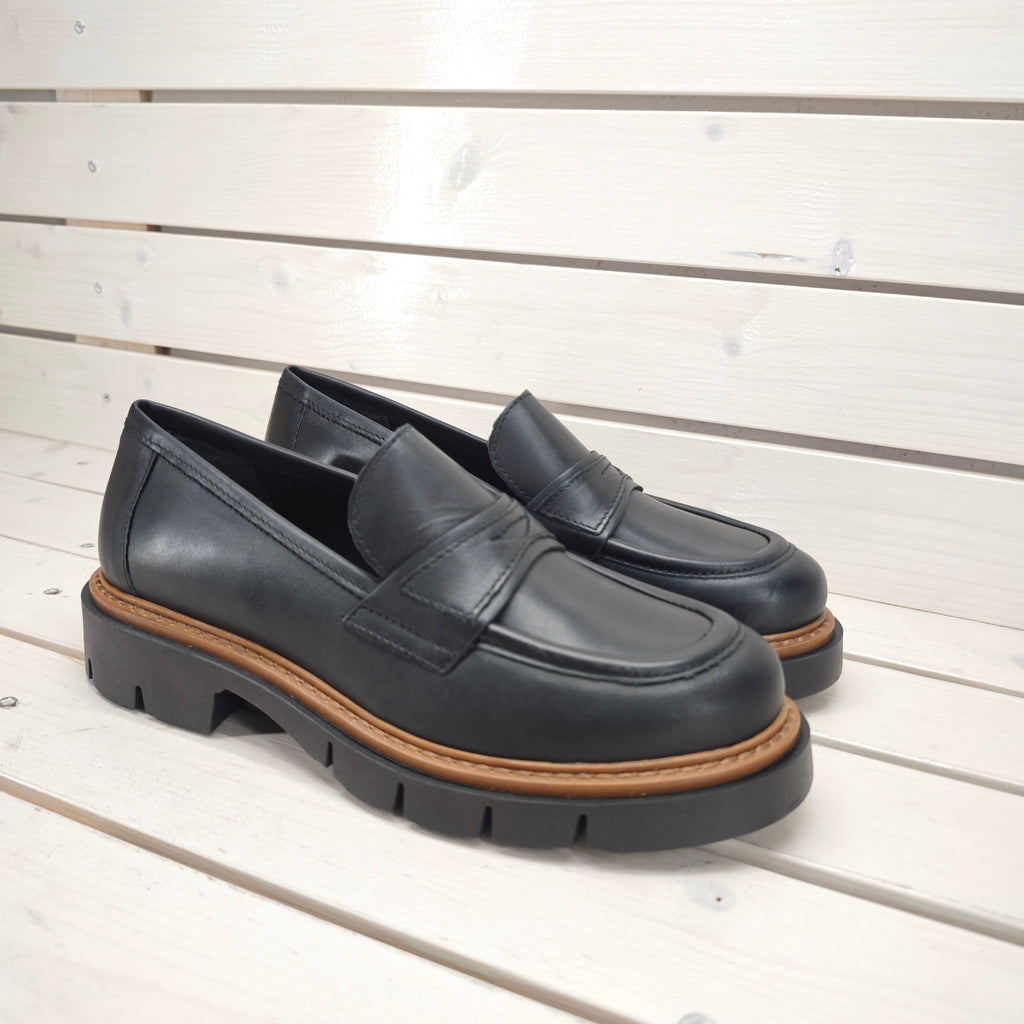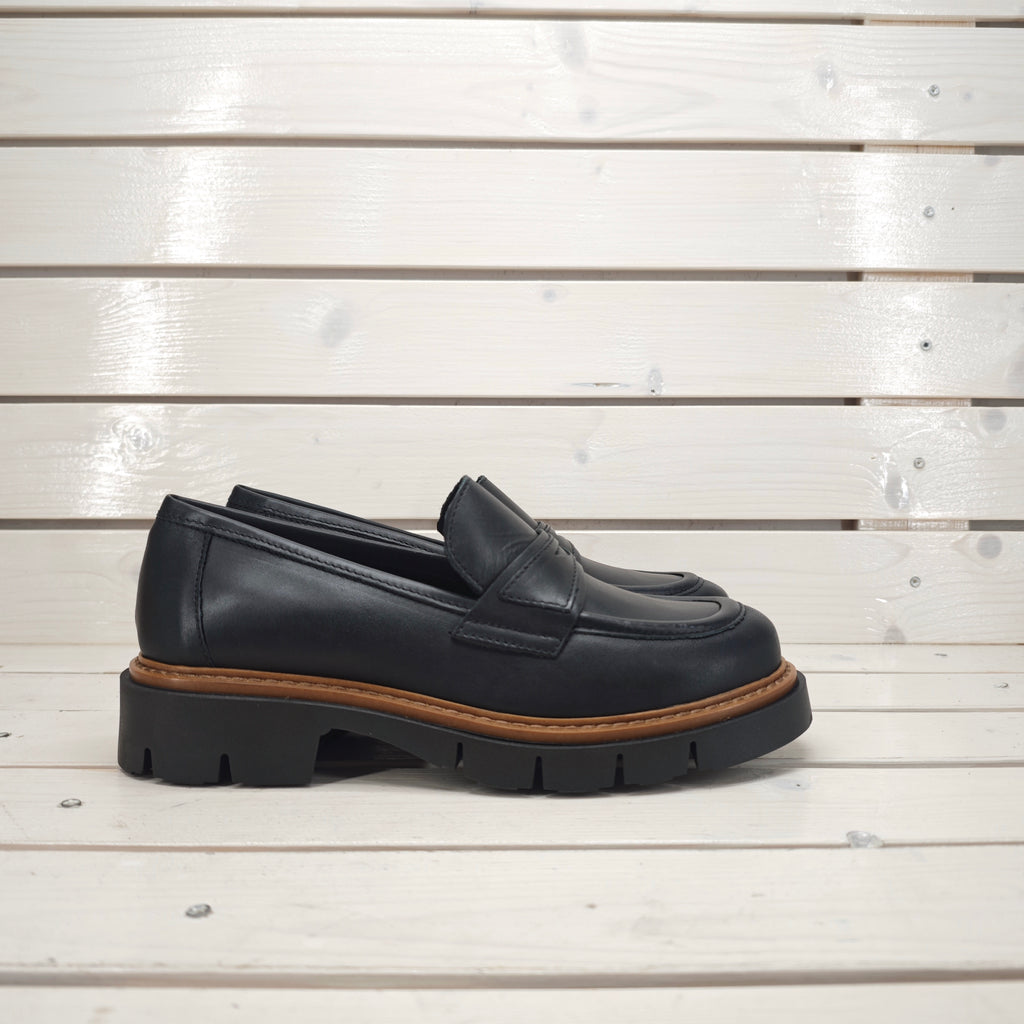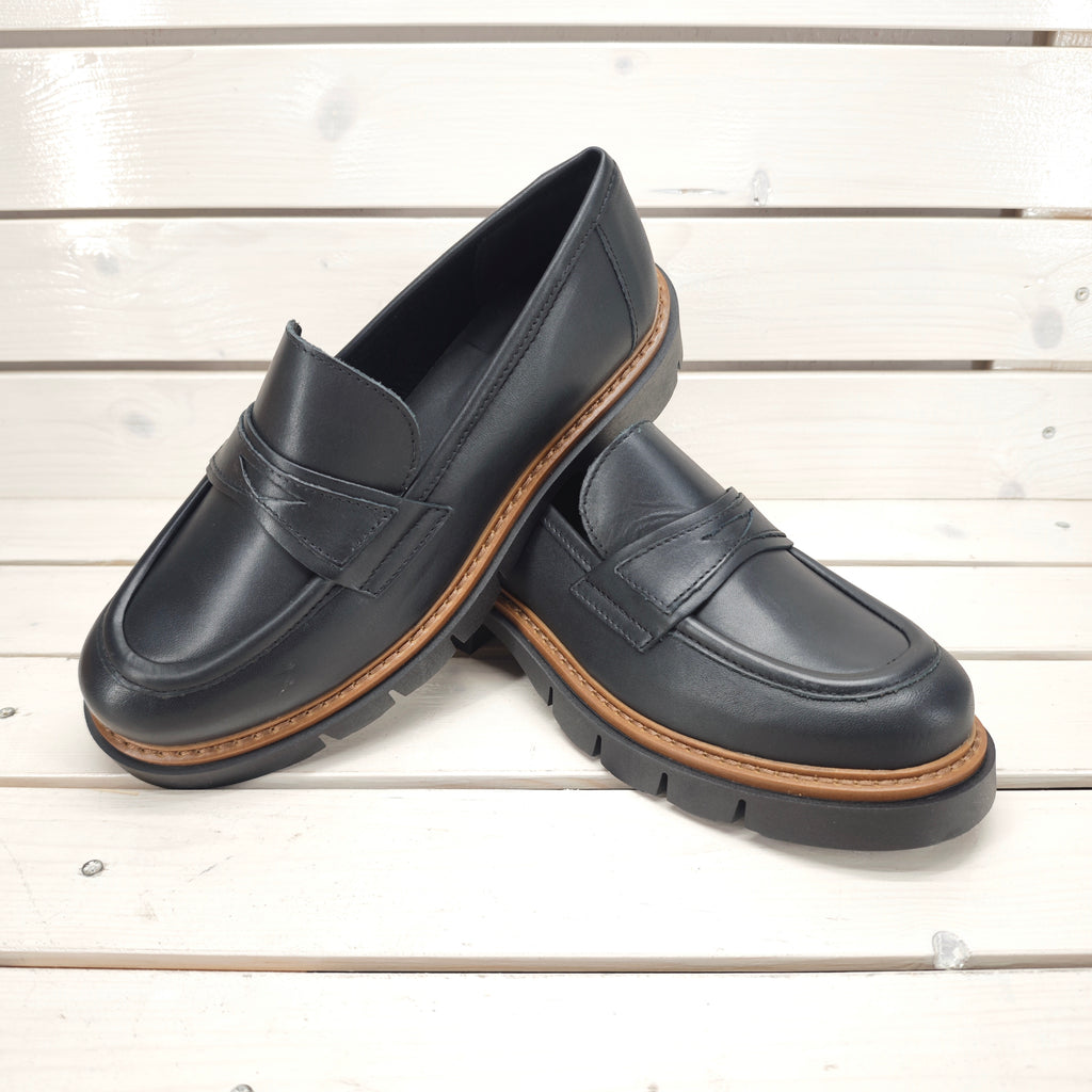 Mocassino con vaschetta e bocca di leone in vera pelle con guardolo in contrasto ; calzata regolare, suola da 3 cm