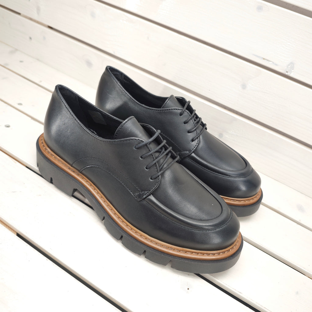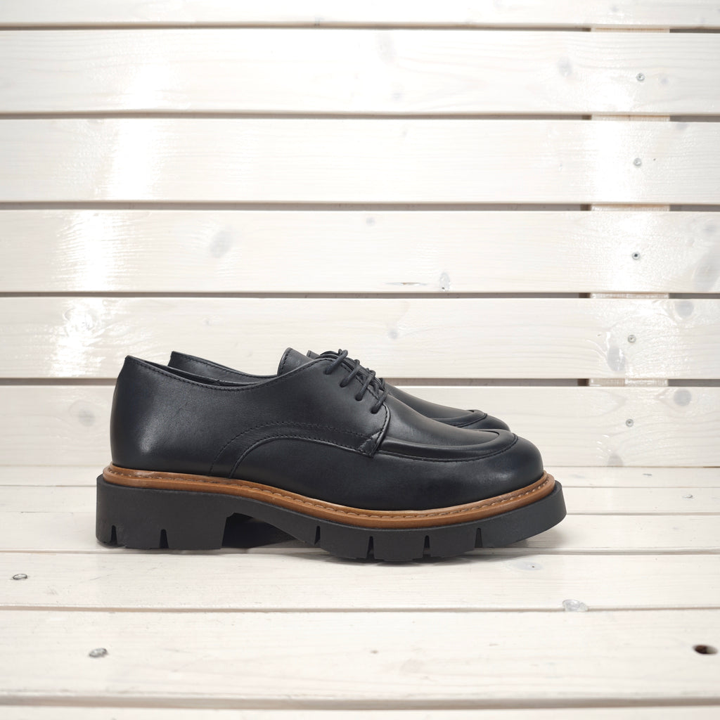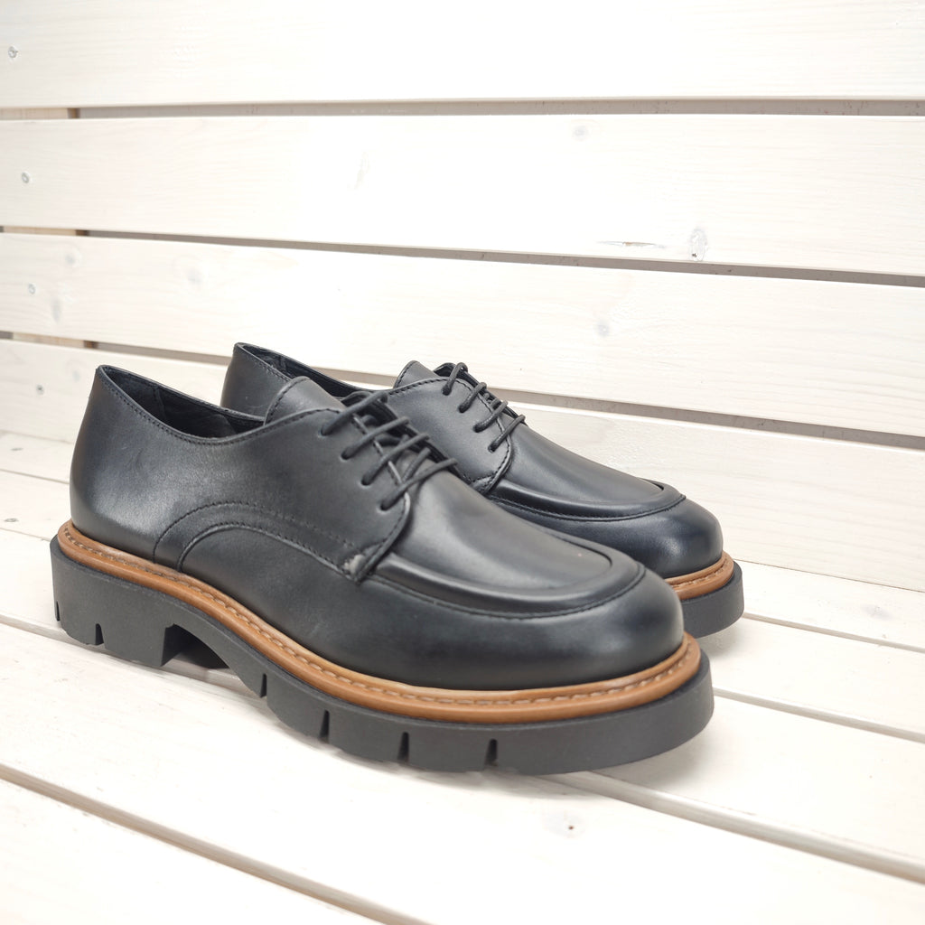 Stringata con vaschetta in vera pelle con guardolo in contrasto ; calzata regolare, suola da 3 cm