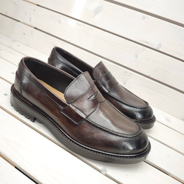 Mocassino in vitello invecchiato esterno e vitello interno; suola in Gomma antiscivolo.