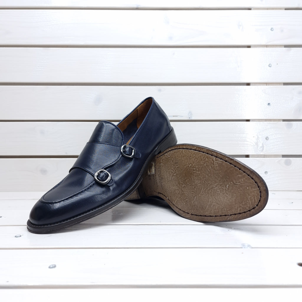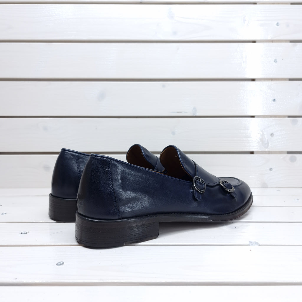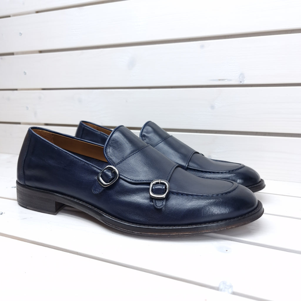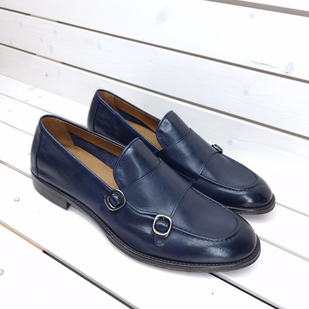 Mocassino cucito a mano con due fibbie, in pelle di vitello interna ed esterna, morbidissimo, con suola in cuoio e antiscivolo