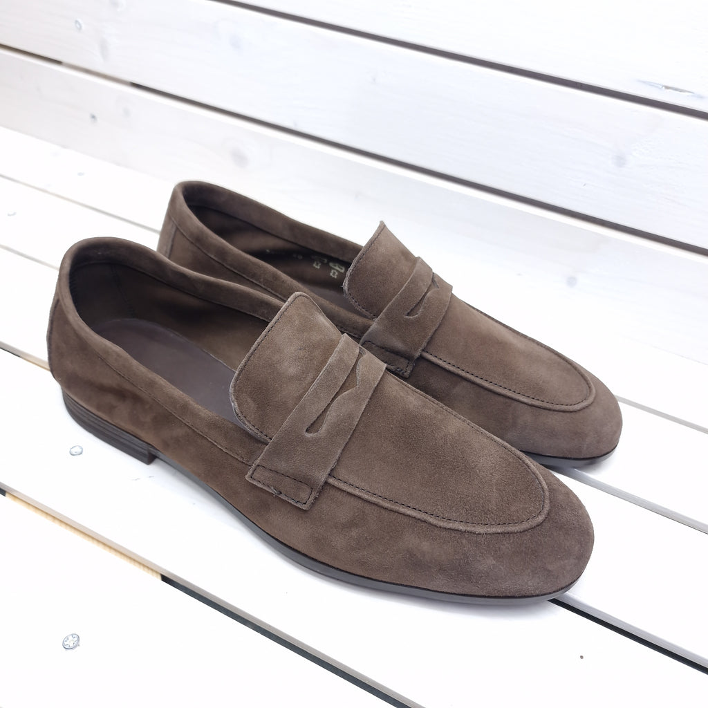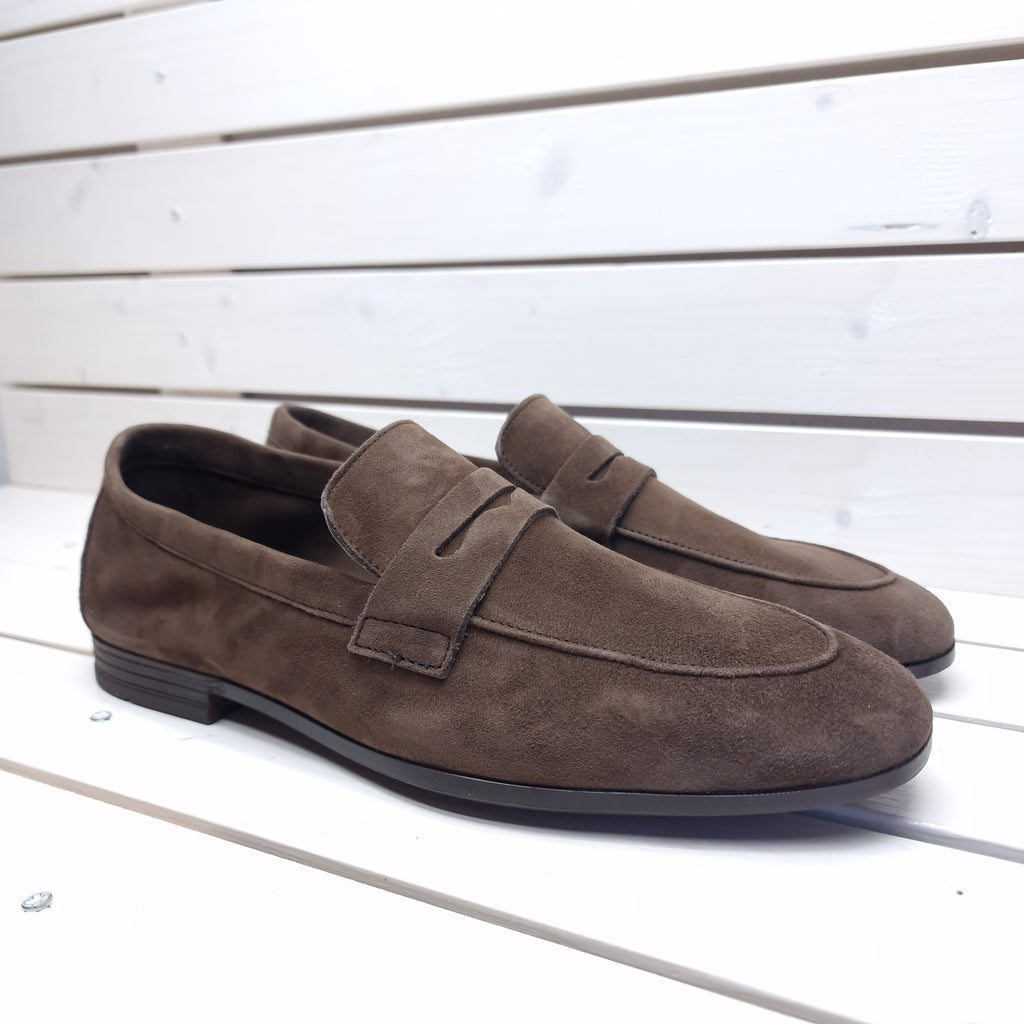 Mocassino in camoscio a marchio Frau, interamente in pelle sfoderata con suola in gomma antiscivolo; prodotto realizzato interamente in Italia da amaestri artigiani