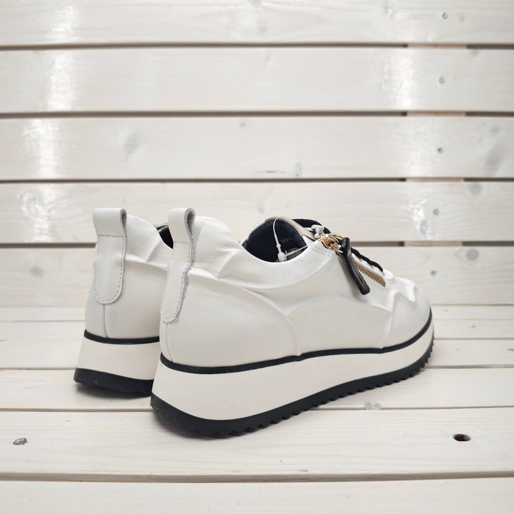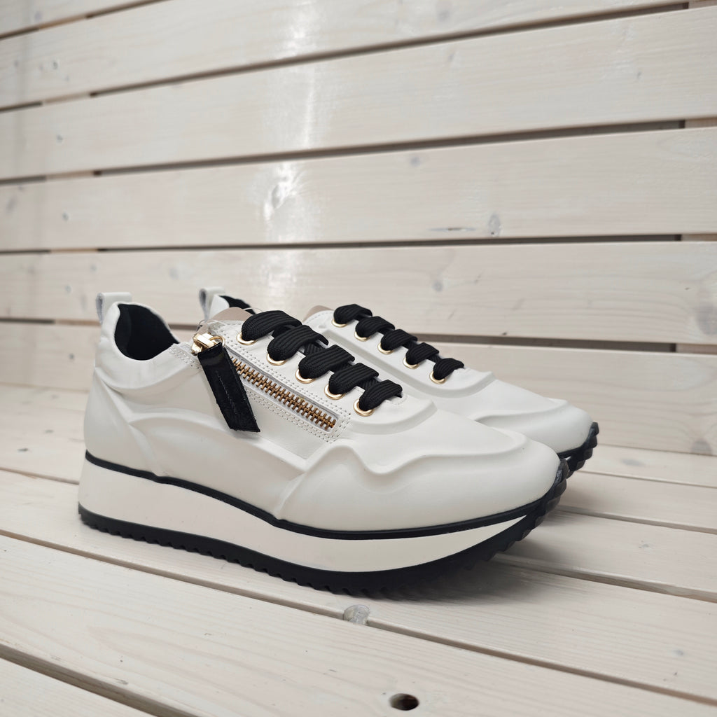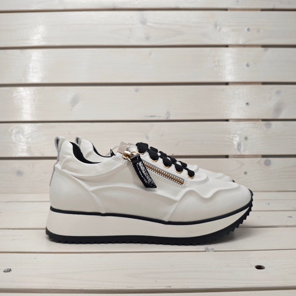Sneaker in pelle con cuciture nascoste e in rilievo, a marchio Grunland con plantare in memory estraibile e cerniera esterna per favorire la calzata; suola rialzata da 3cm