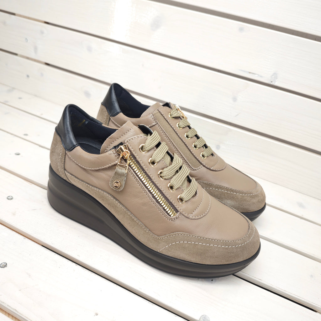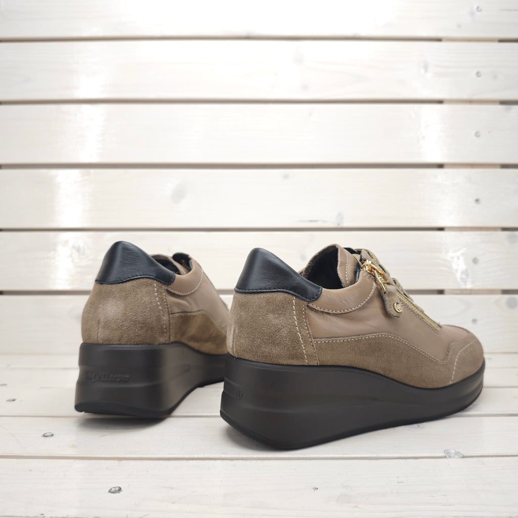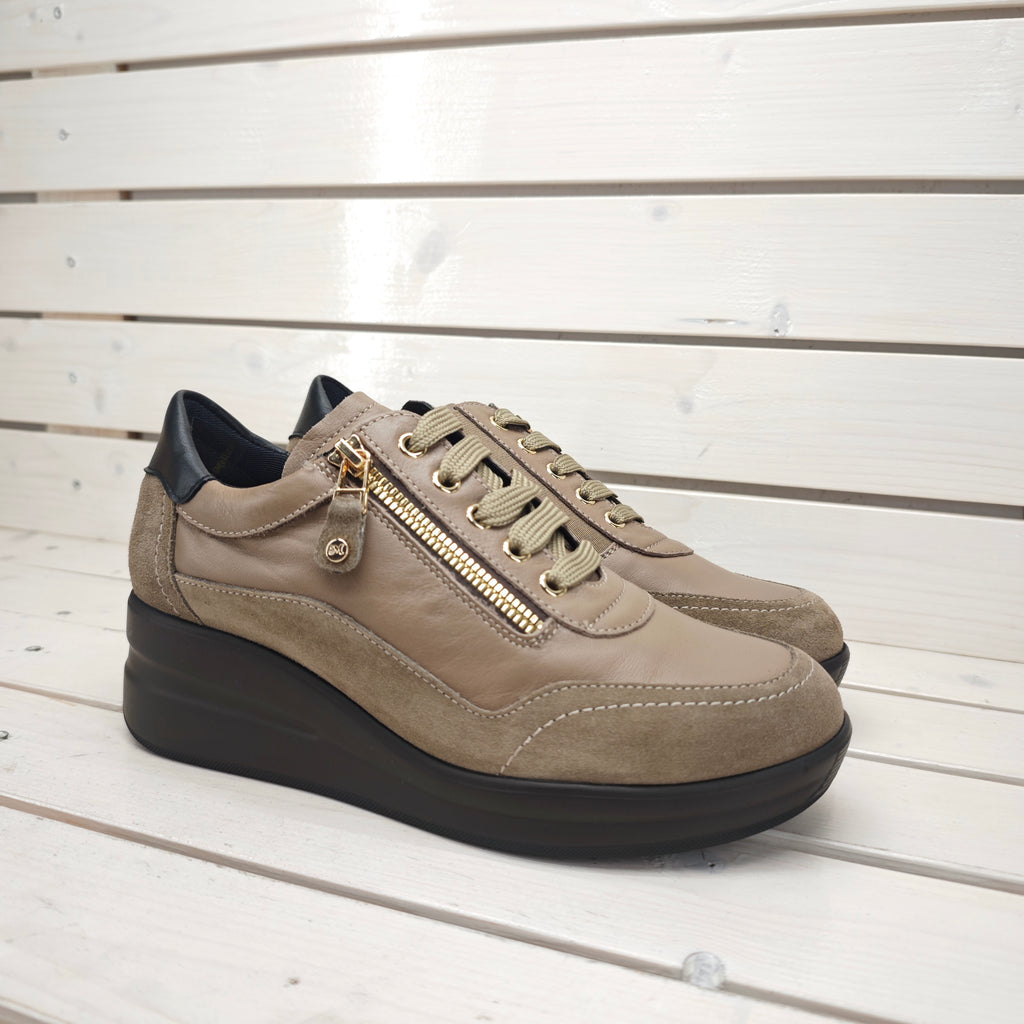 Sneaker a marchio Melluso in vera pelle interna ed esterna conzeppa da 5 cm cerniera laterale; produzione interamente Italiana.