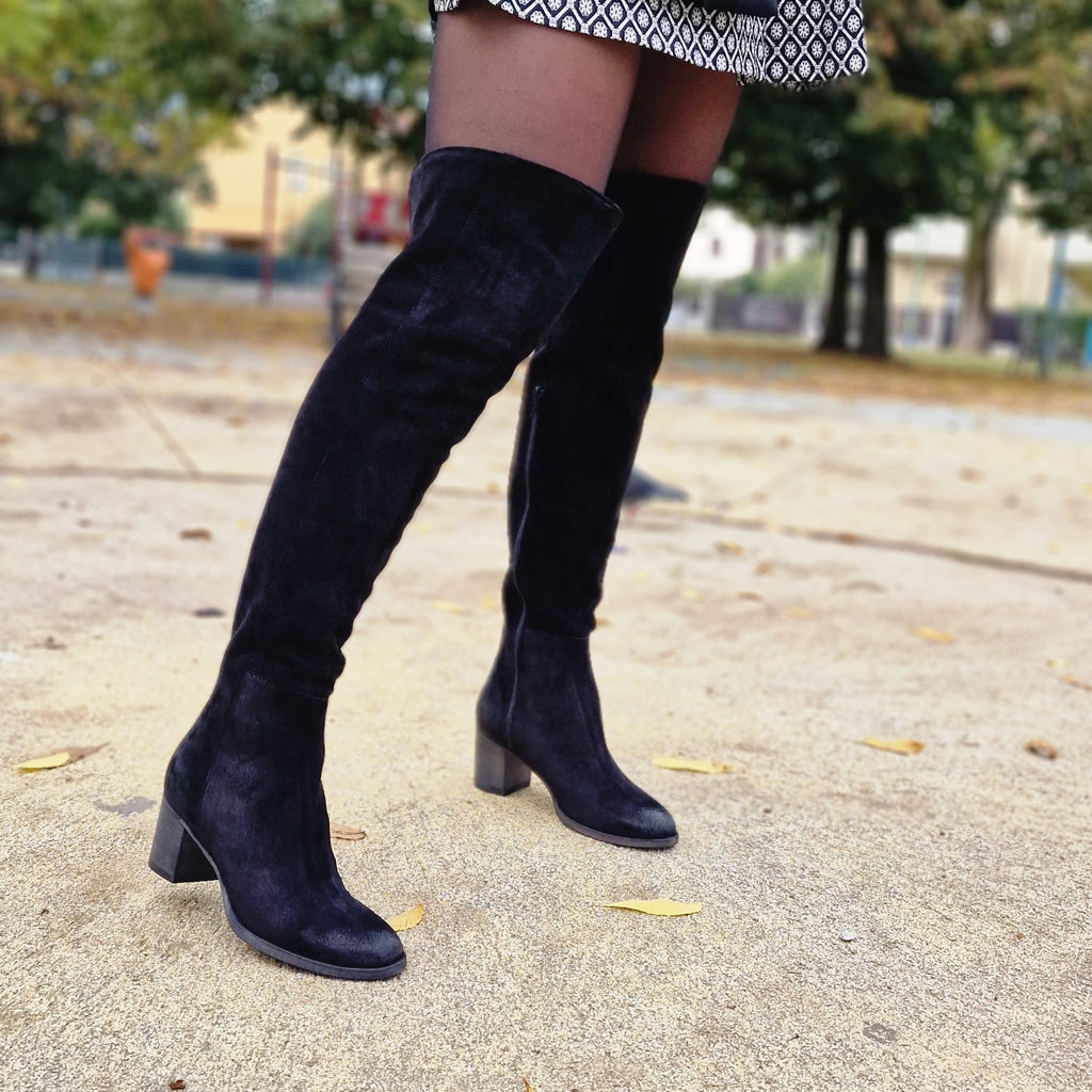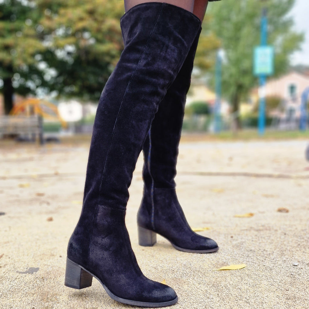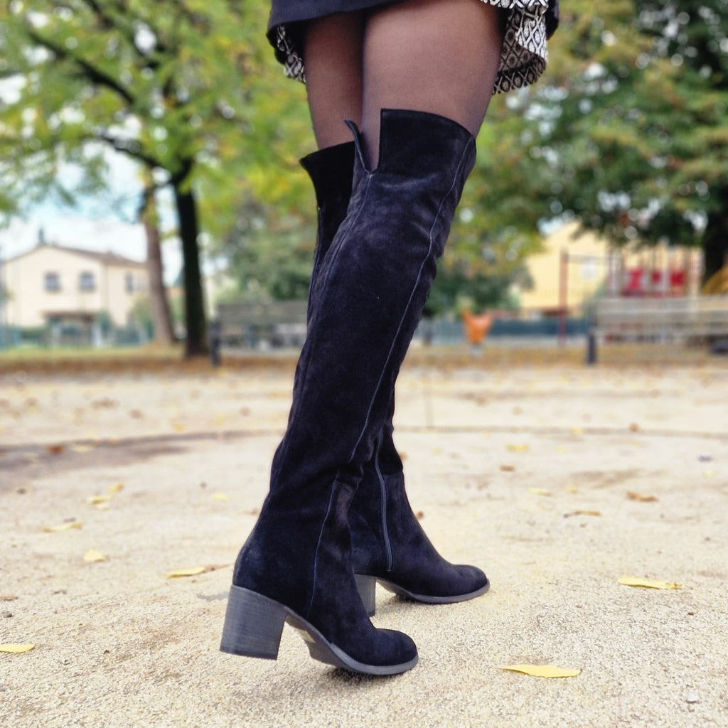 Stivale sopra al ginocchio in camoscio ingrassato, vera pelle, suola e tacco in legno, calzata di gamba confortevole con sportività e comodità assicurata dalla morbidezza del gambale. Mezza cerniera per favorire la calzata, regolare. Tacco 5 cm