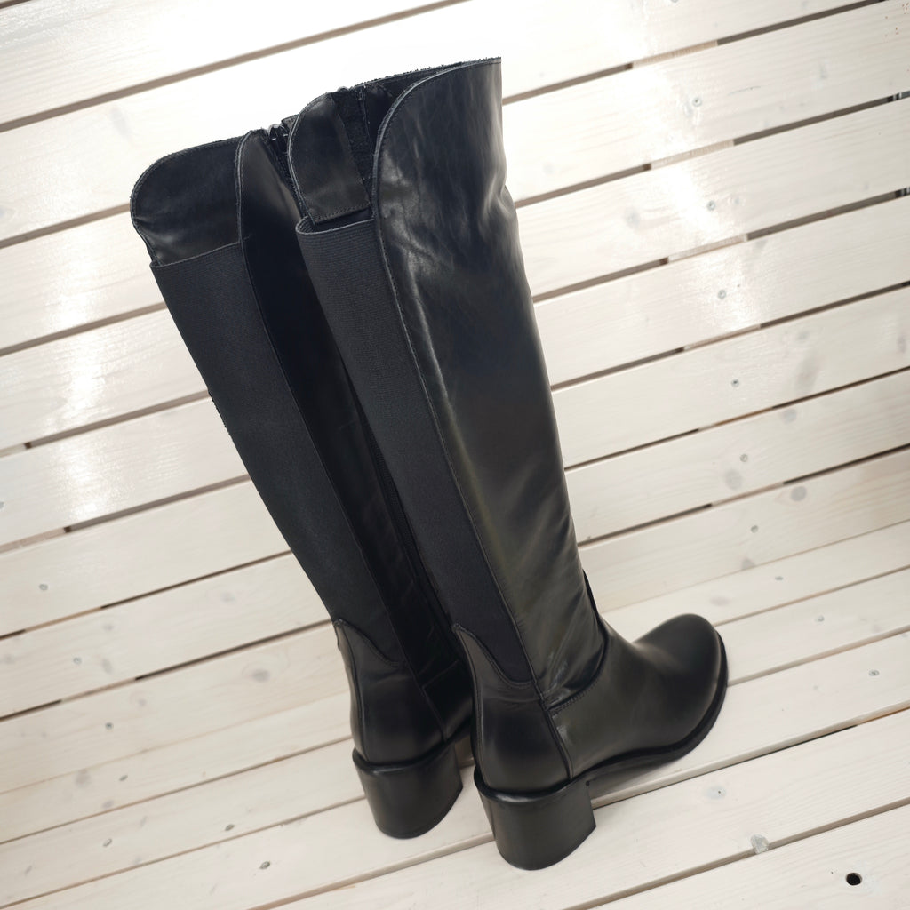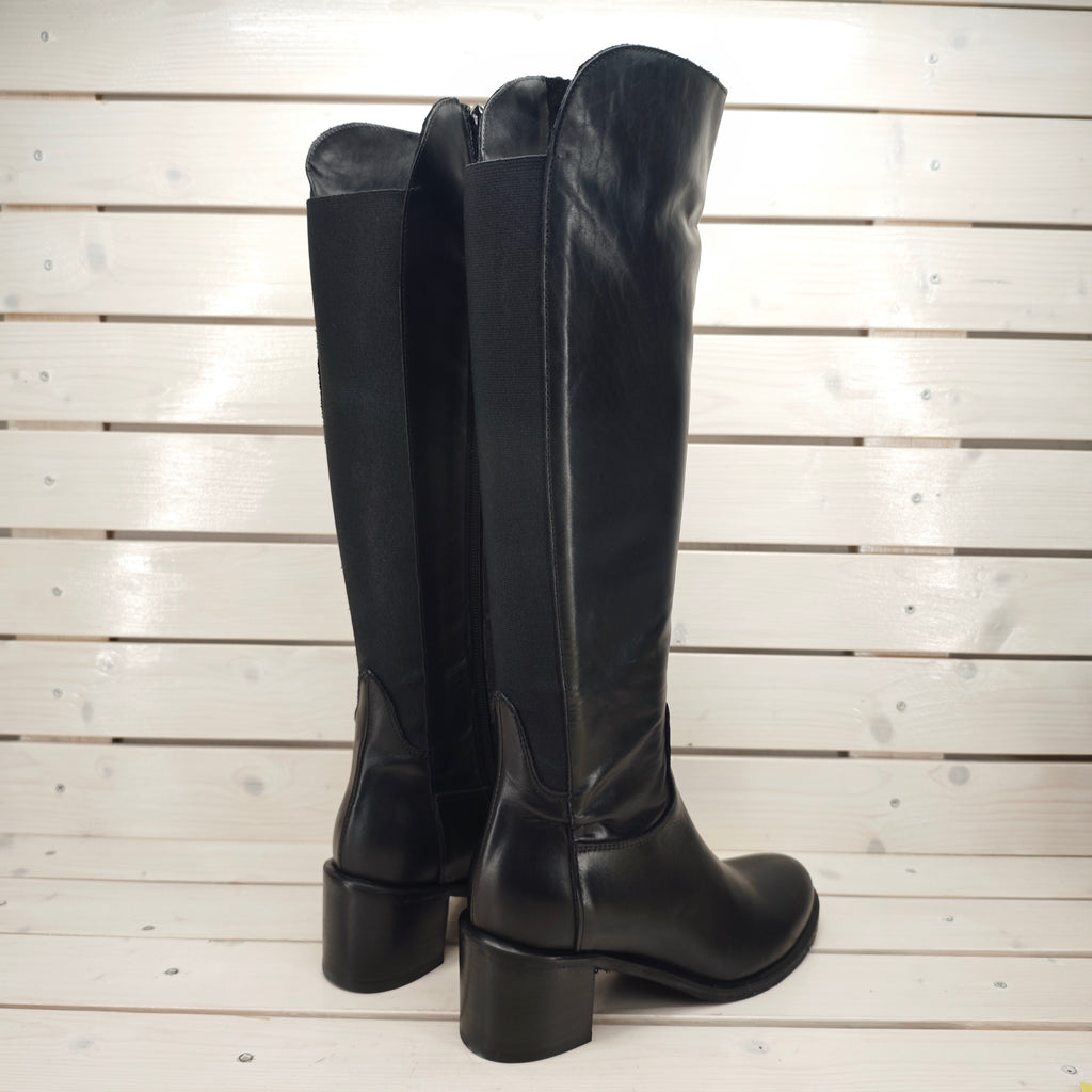 Stivale cavallerizza in vera pelle, con cerniera interna a mezza gamba ed elastici posteriori.