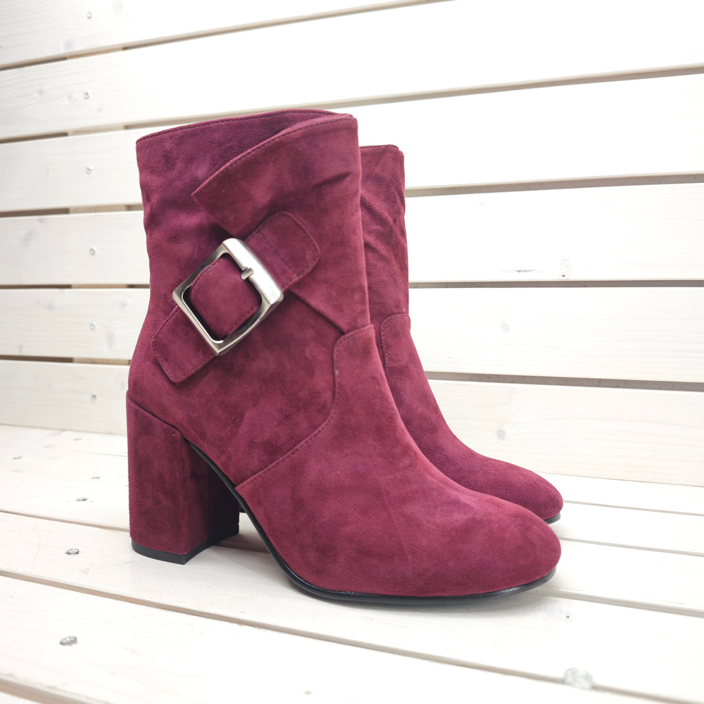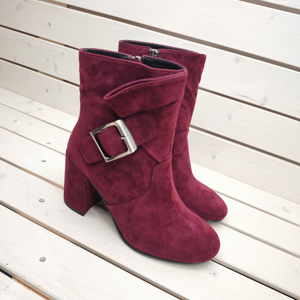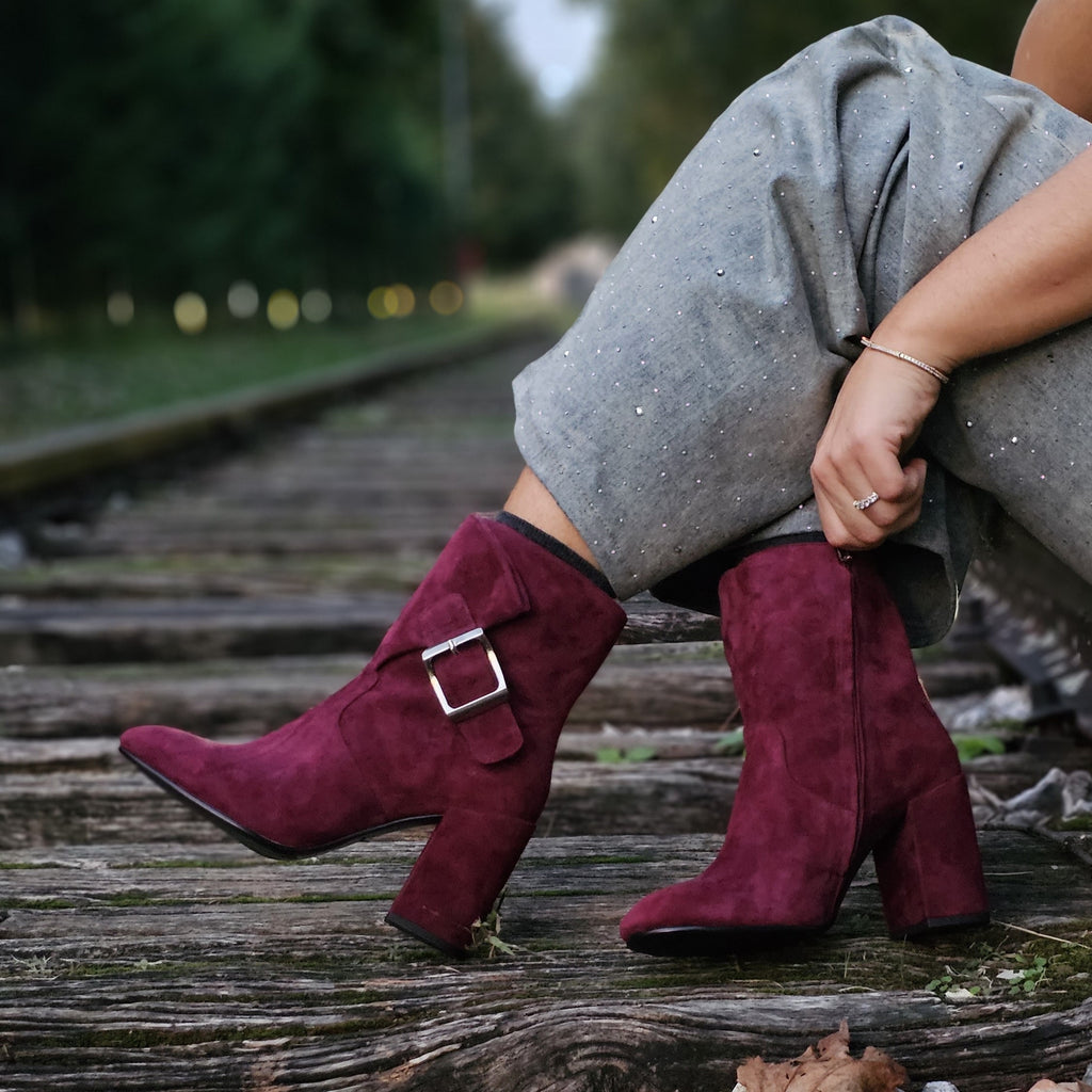 stivaletto di camoscio in vera pelle interna ed esterna con fibbia laterale e punta tonda, soletta imbottita in memory foam molto confortevole, tacco da 9cm con suola in gomma antiscivolo
