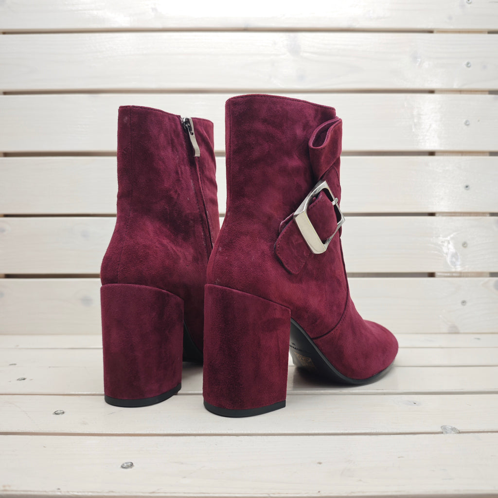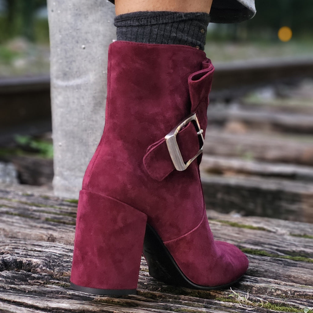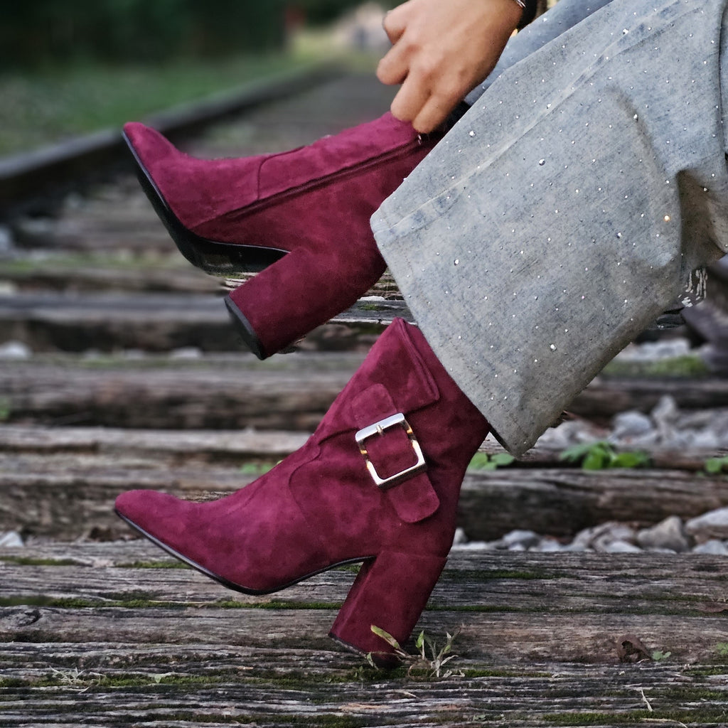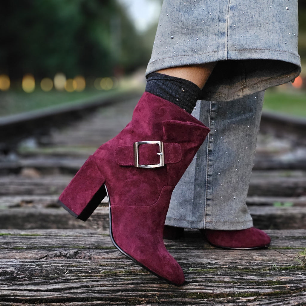 stivaletto di camoscio in vera pelle interna ed esterna con fibbia laterale e punta tonda, soletta imbottita in memory foam molto confortevole, tacco da 9cm con suola in gomma antiscivolo