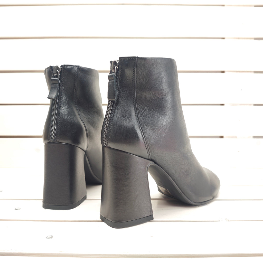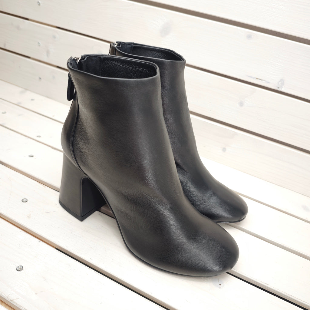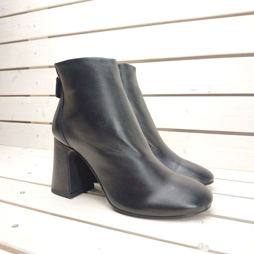 Stivaletto in nappa di pelle, tacco 8 cm, estremamente morbido con punta arrotondata; calzata regolare con cerniera sul retro
