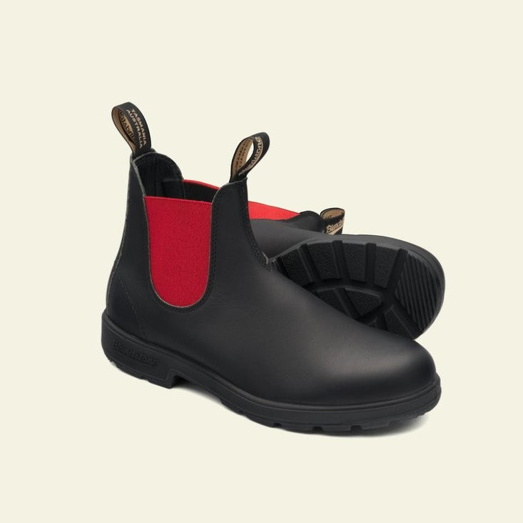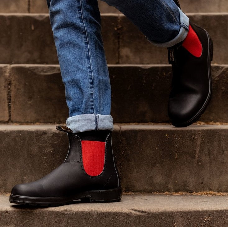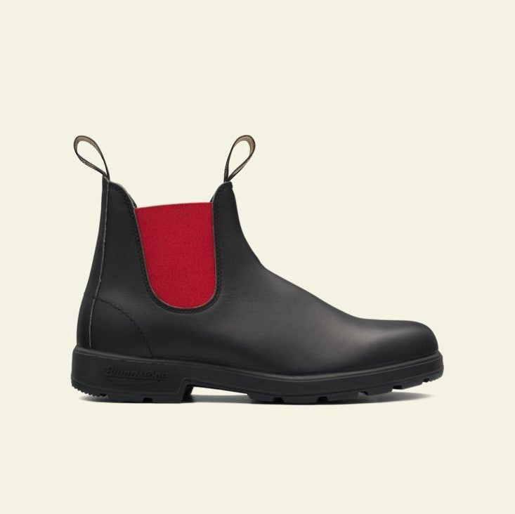 Rendi unico il tuo look indossando gli stivaletti in stile Chelsea modello Blundstone #508, realizzati in pelle nera impermeabile con elastici laterali rossi. Presentano tomaia liscia con impunture frontali e sul tallone tono su tono.
