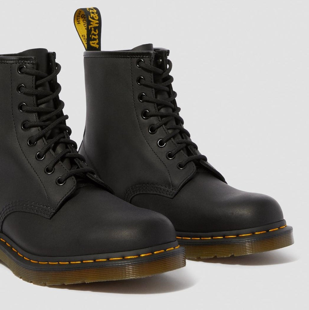 1460 è l’originale stivale Dottor Martens. Il suo DNA immediatamente riconoscibile presenta 8 occhielli, la classica pelle Dr. Martens ingrassata nera, bordi scanalati, una fettuccia posteriore con logo, cuciture gialle e una confortevole suola a cuscinetto.