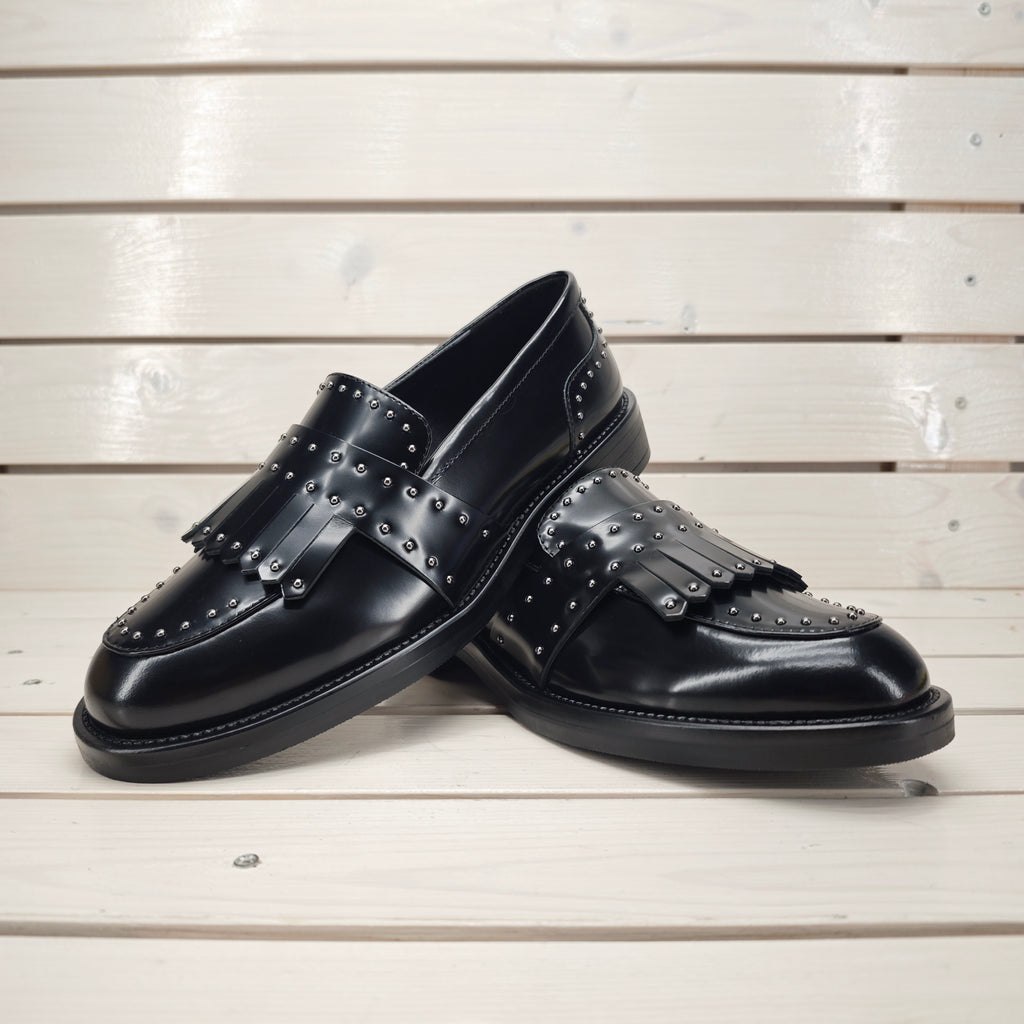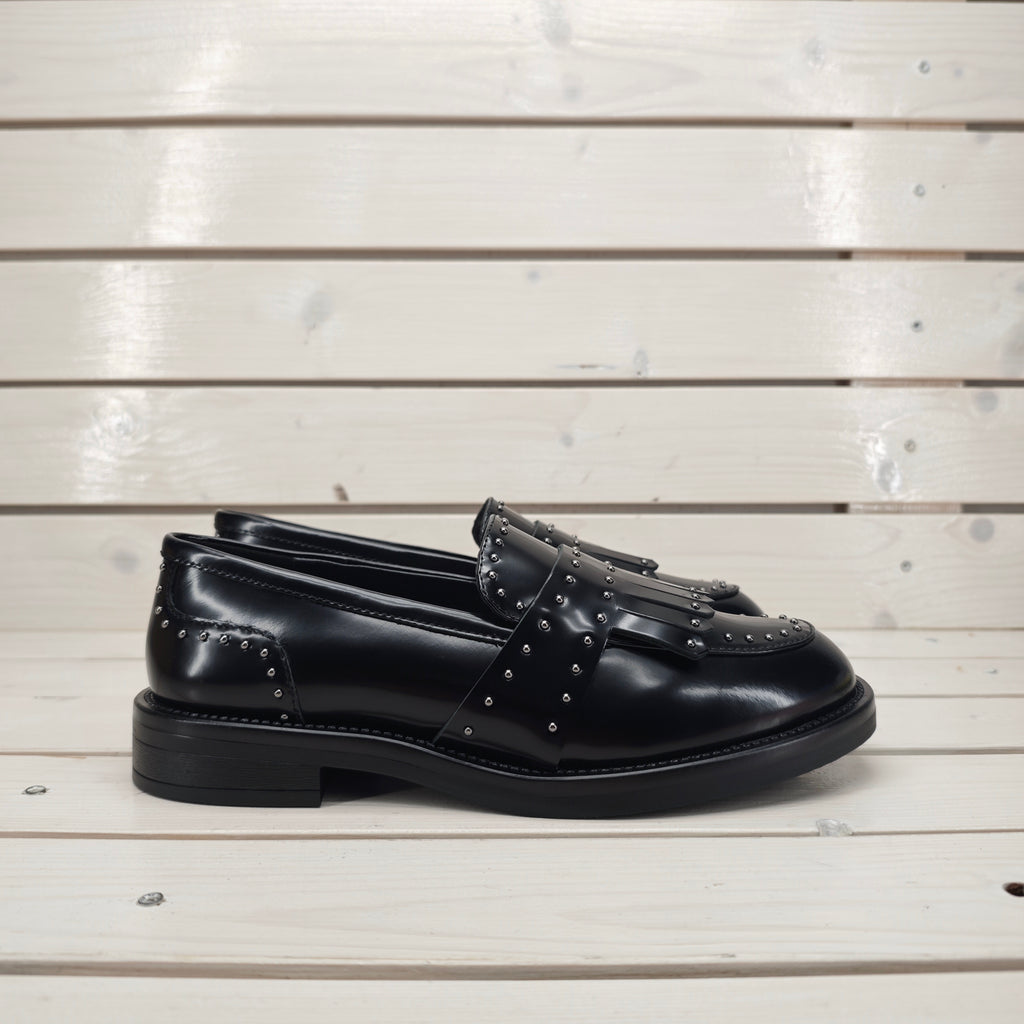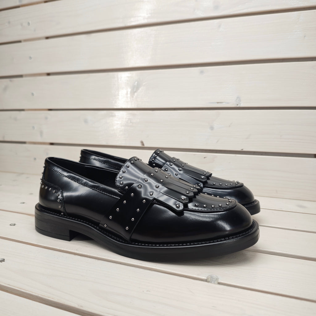Mocassino in vera pelle abrasivata con frangetta e borchiette satinate