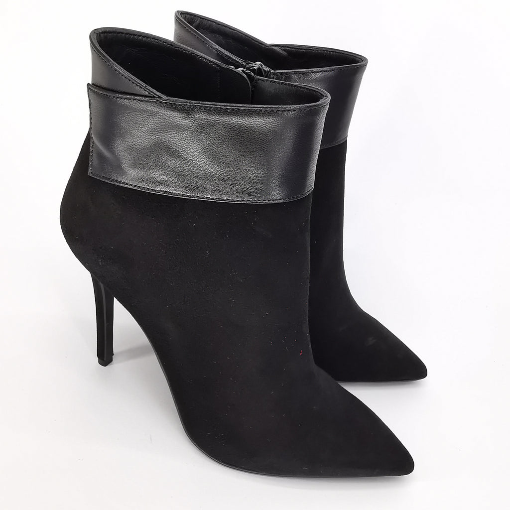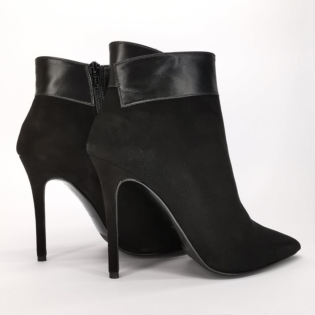 Stivaletto in camoscio nero con inserto superiore in pelle nera, tacco 9cm; tomaia in vera pelle interna ed esterna, suola in cuoio.