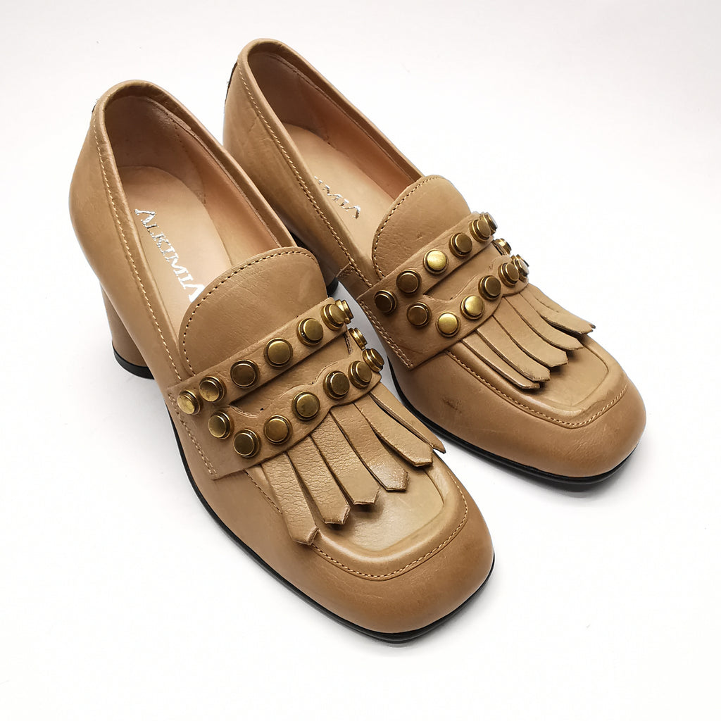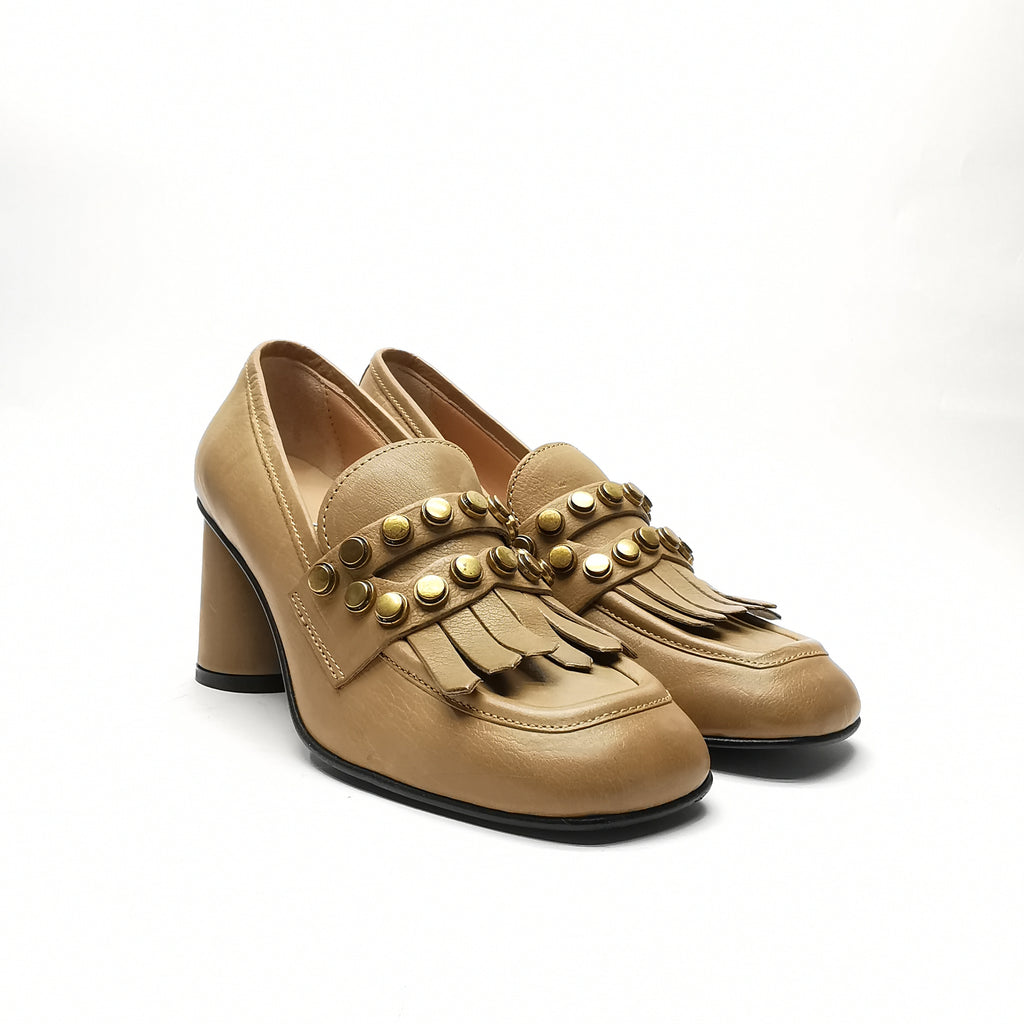 Mocassino in nappa con borchiette e frangetta sul collo del piede; tacco a isola da 7 cm