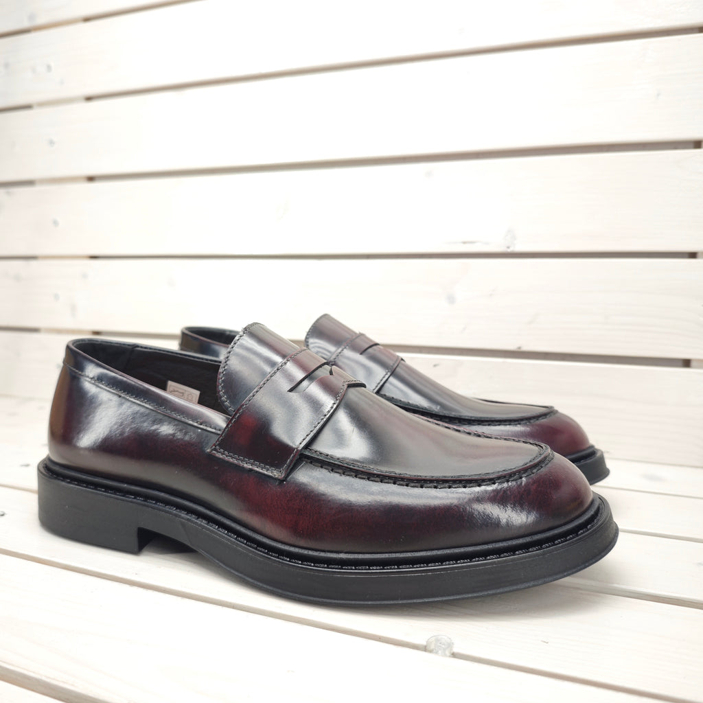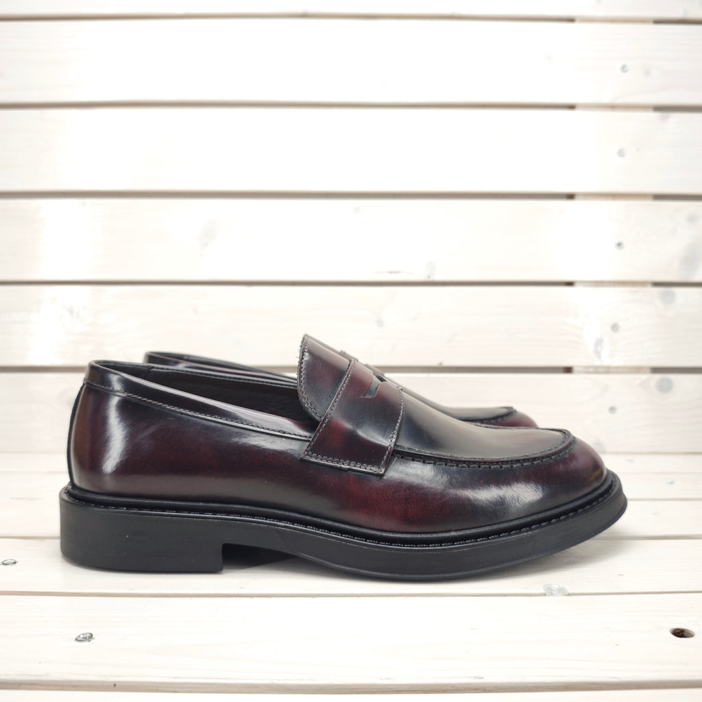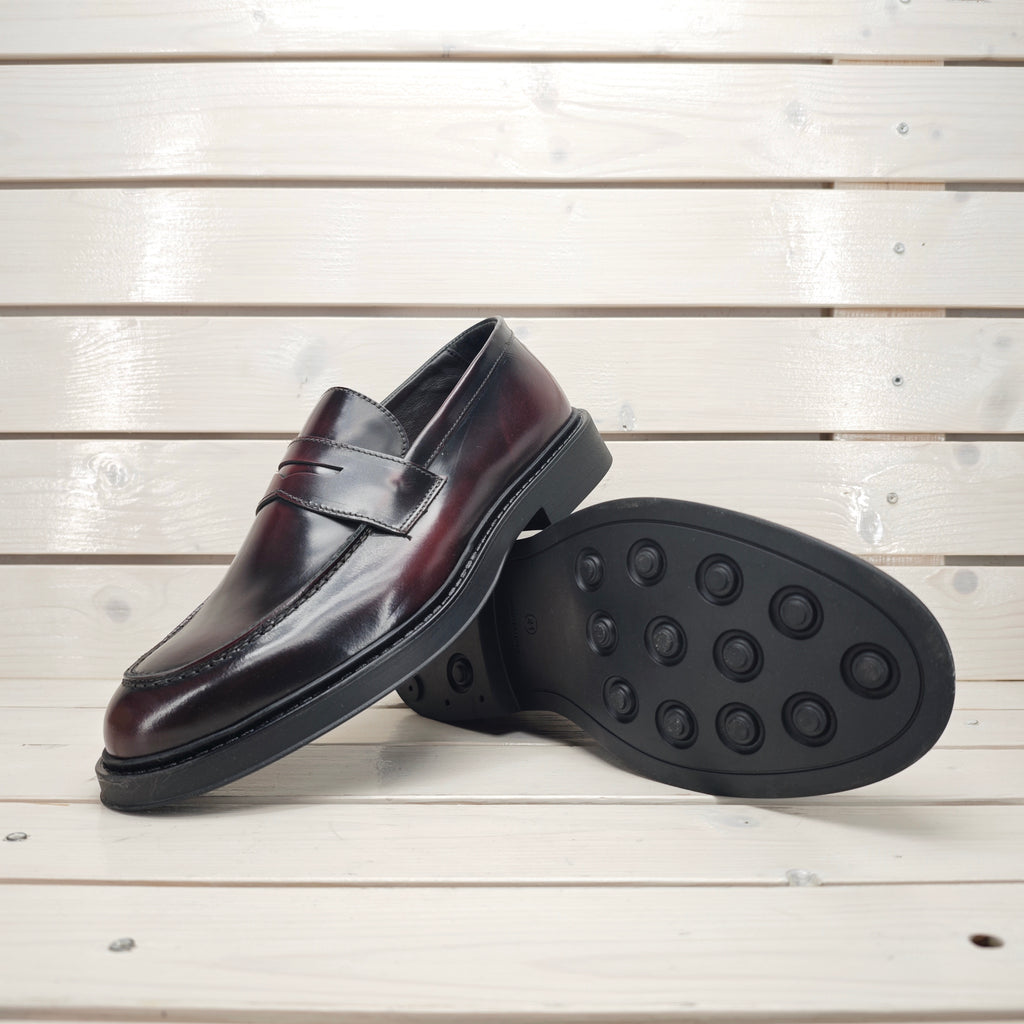 Mocassino in vitello abrasivato esterno e vitello interno; suola in Gomma antiscivolo.