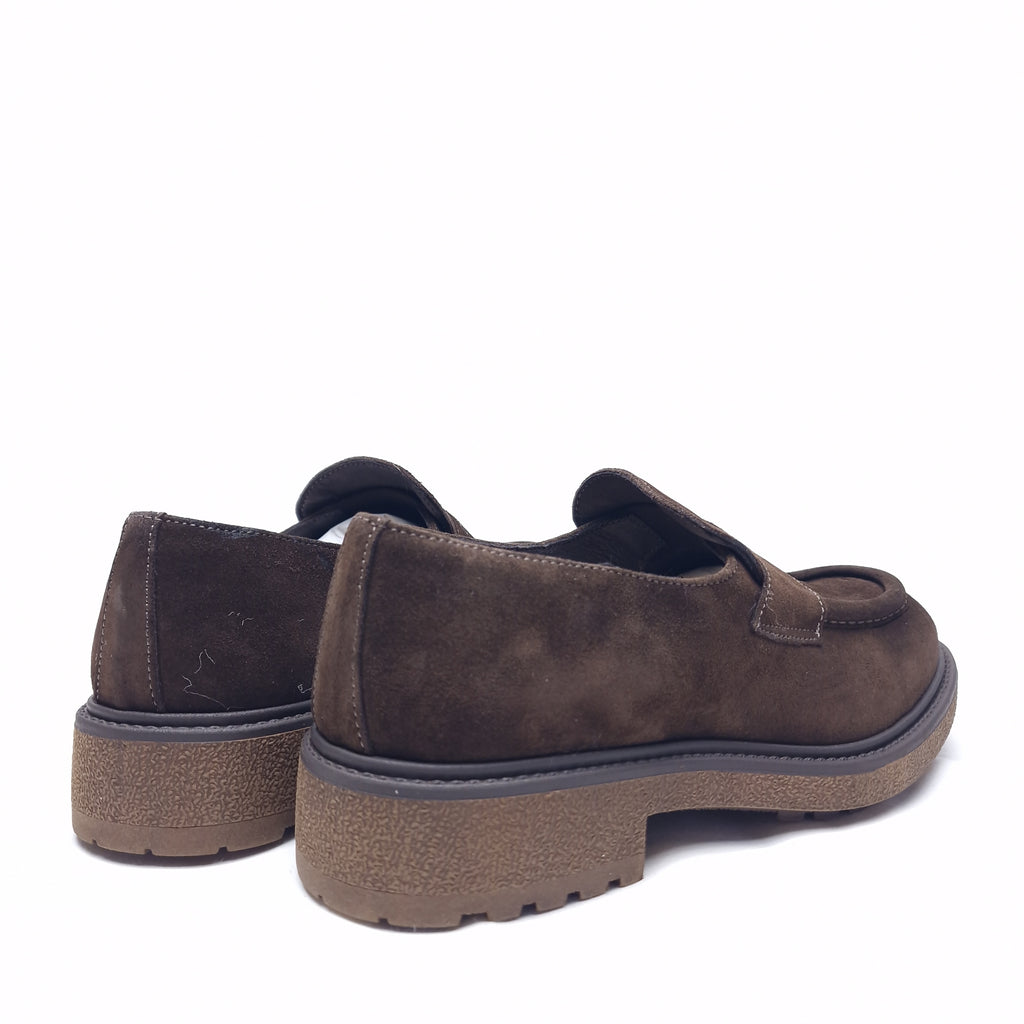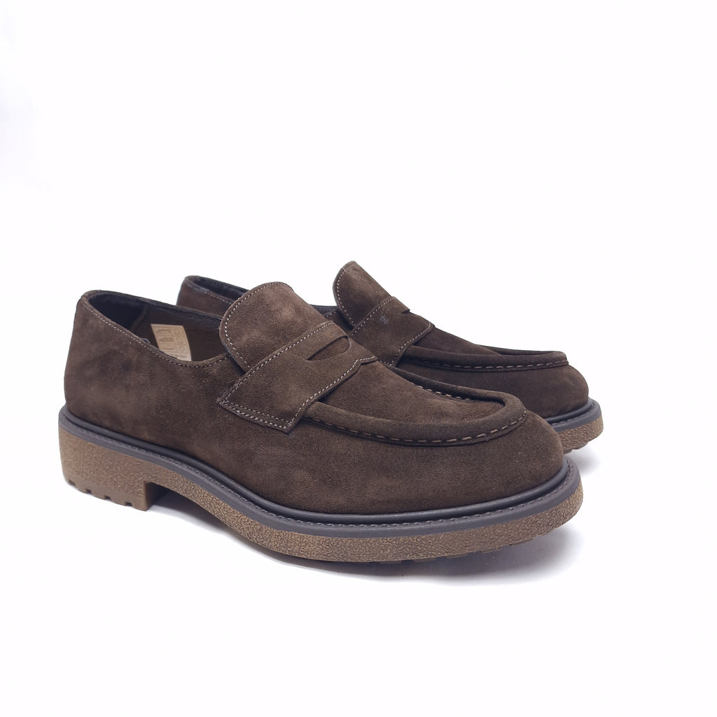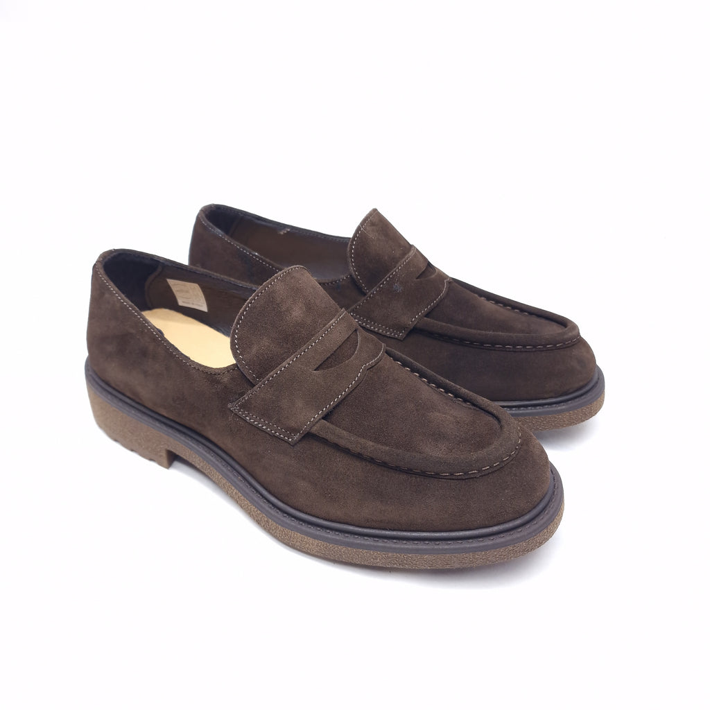 Mocassino college in camoscio, vera pelle interna ed esterna con suola in gomma bottolata vintage; calzata regolare confortevole