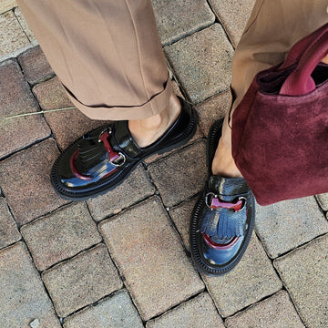 Mocassino in nappa laccata, pelle nera con suola platform da 4 cm bicolor; l'accessorio in tinta con la cucitura della mascherina completa la grinta di questa calzatura