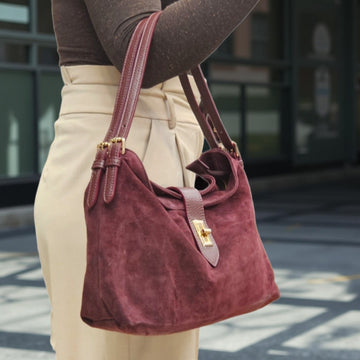 Borsa in camoscio Made in Italy. Dotata di tracolla regolabile inclusa, si adatta facilmente ad ogni occasione e outfit. Chiusura con cerniera e girello.
