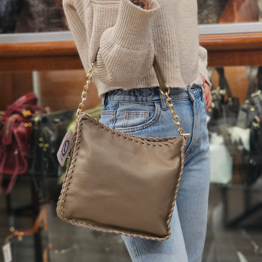 Borsa in vera pelle Made in italy. La chiusura è con cerniera e la borsa è impreziosita da una lavorazione intrecciata sul contorno. è possibile utilizzarla anche comodamente a tracolla. La tracolla regolabile si trova all'interno.